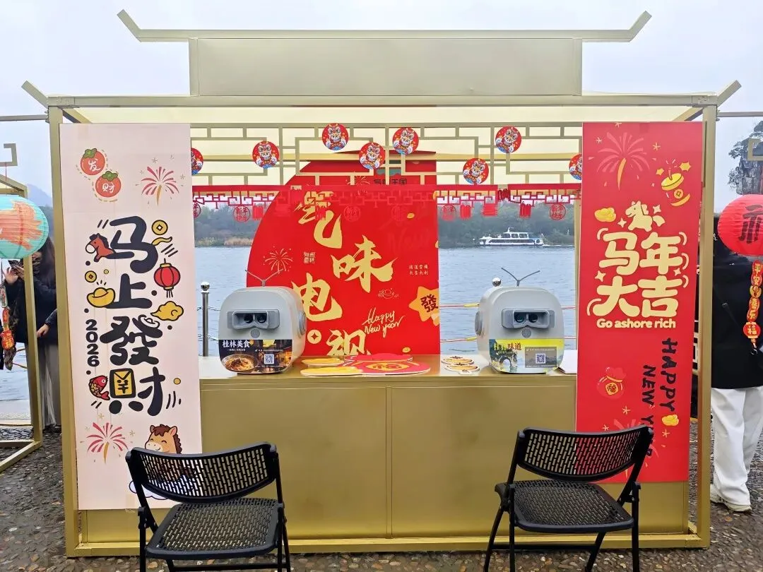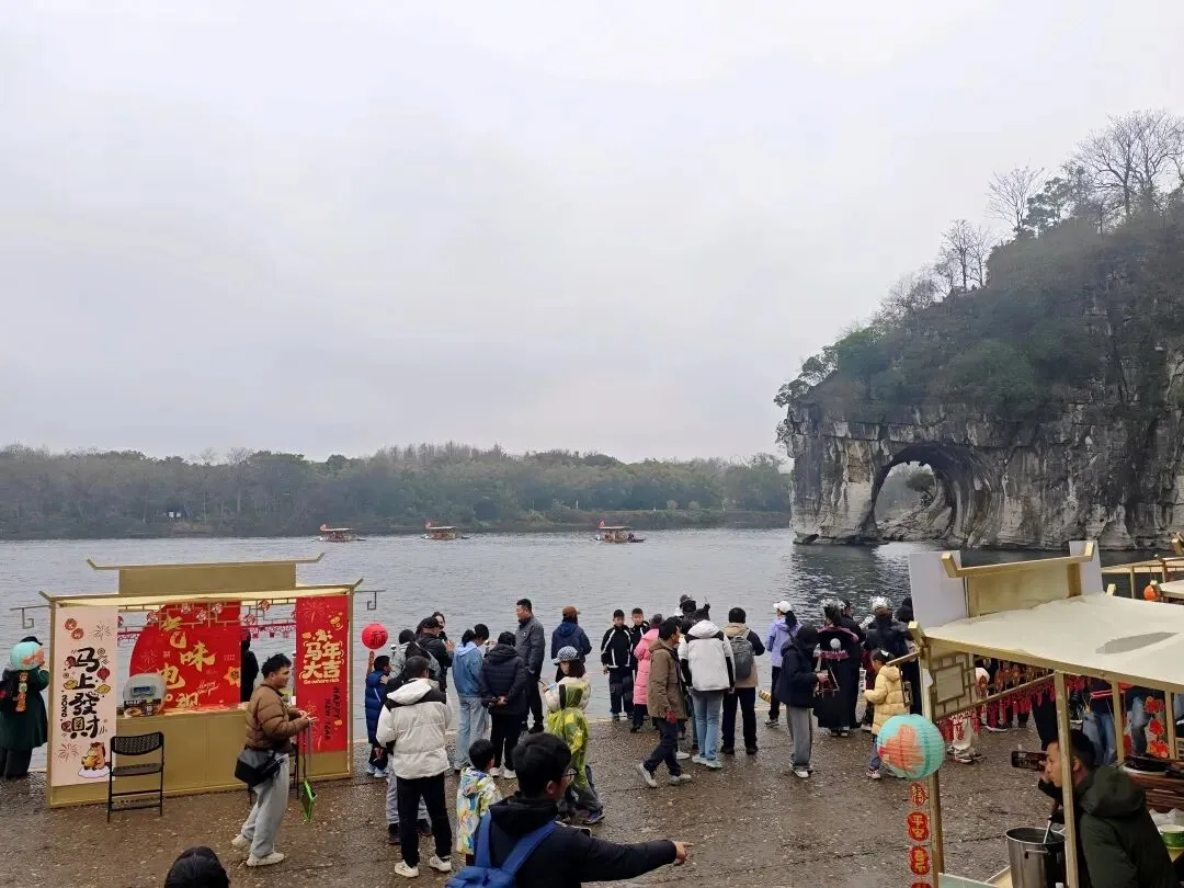 近日,中央广播电视总台CCTV-13《品中国年味》新春直播活动来到桂林象鼻山。在秀美的山水之间,由旅投会展策划有限公司打造的旅圩集市,成为镜头里一道温暖又热闹的风景。