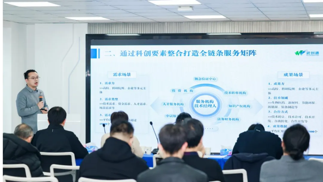 武汉武创通科技服务有限公司代表进行了武创通科创服务推介,重点介绍了“武创天地”科创园以及武创通科创服务平台的功能定位、服务内容与特色优势,助力更多创新项目找到适配的孵化载体与全周期服务支持。