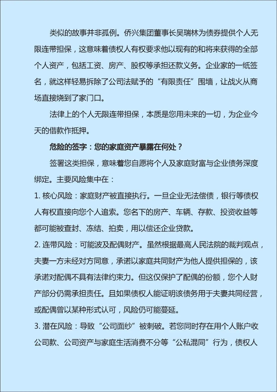 类似的故事并非孤例。侨兴集团董事长吴瑞林为债券提供个人无限连带担保,这意味着债权人有权要求他以现有的和将来获得的全部个人资产,包括工资、房产、股权等承担还款义务。企业家的一纸签名,就这样轻易拆除了公司法赋予的“有限责任”围墙,让战火从商场直接烧到了家门口。