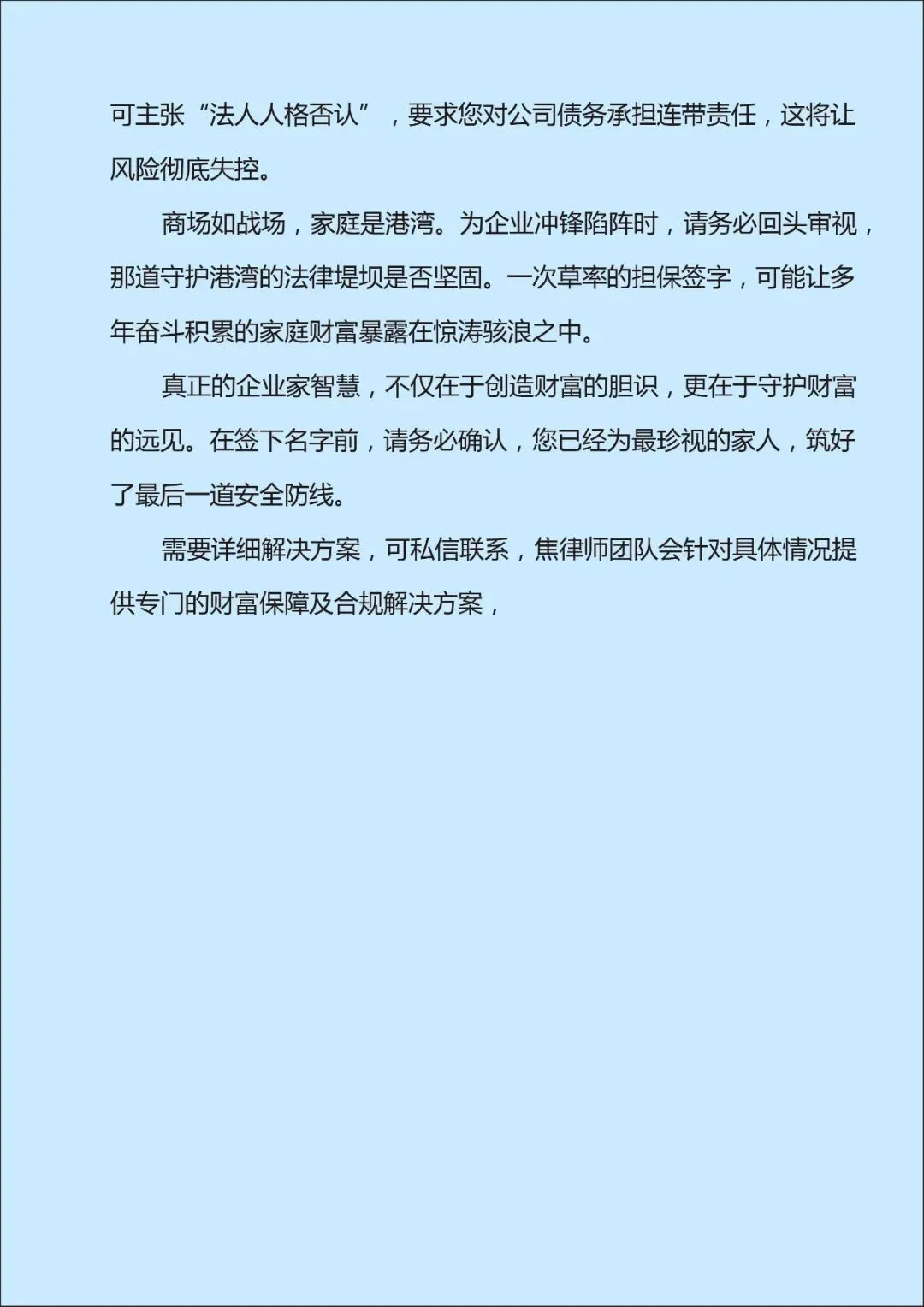 企业是战场,家庭是港湾。为企业冲锋陷阵时,请务必回头审视,那道守护港湾的法律堤坝是否坚固。一次草率的担保签字,可能让多年奋斗积累的家庭财富暴露在惊涛骇浪之中。