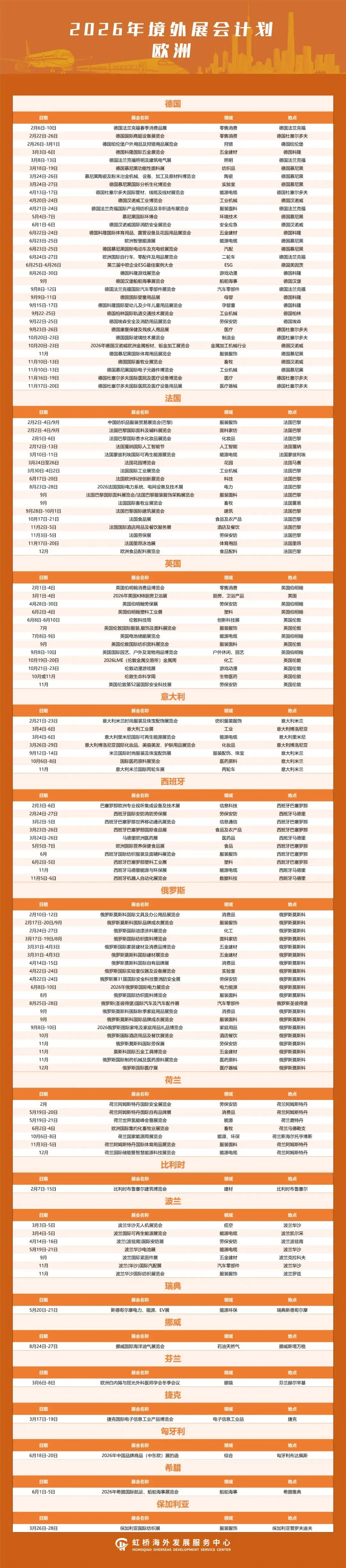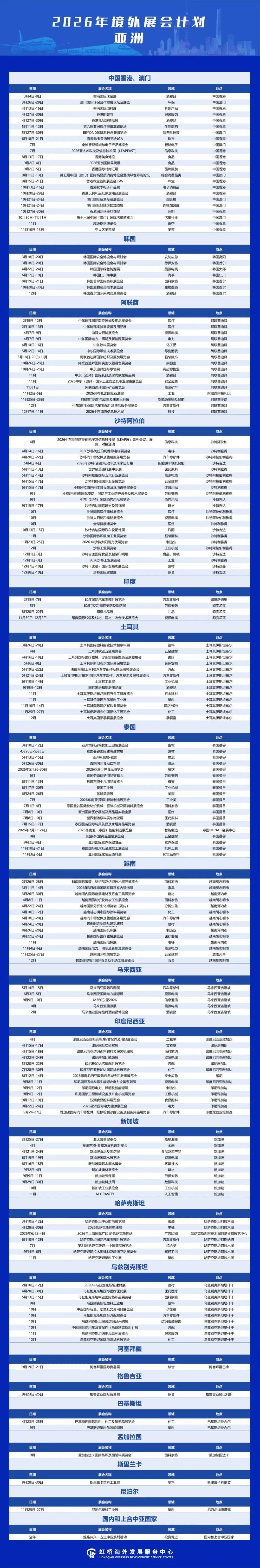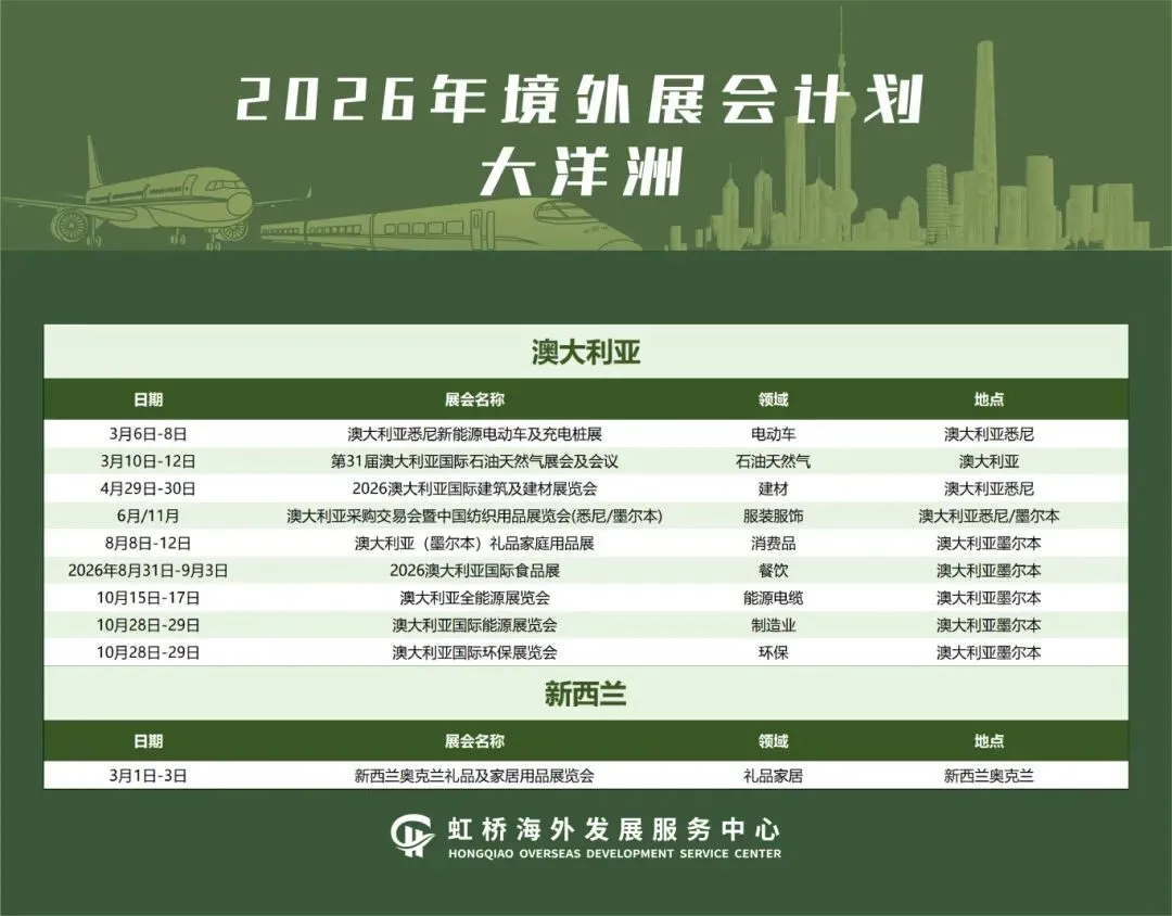 境外展会作为开拓国际市场和获取订单的重要来源,对外贸企业拓展市场、抢抓订单具有十分重要作用。为更大力度支持企业争取海外优质展会资源,扩大贸易机遇、拓展外贸市场,助力国际贸易中心提质升级,加快建设长三角企业走出去服务第一站,虹桥国际中央商务区梳理整合了2026年境外重点推荐展会,覆盖亚洲、欧洲、非洲、北美洲、南美洲、大洋洲等6大洲、56个国家/地区的408场专业展会,聚焦人工智能、生物医药、新能源等重点产业领域,助力企业精准对接国际产业前沿、深度参与全球专业交流、拓展多元国际市场。具体展会信息汇总如下: