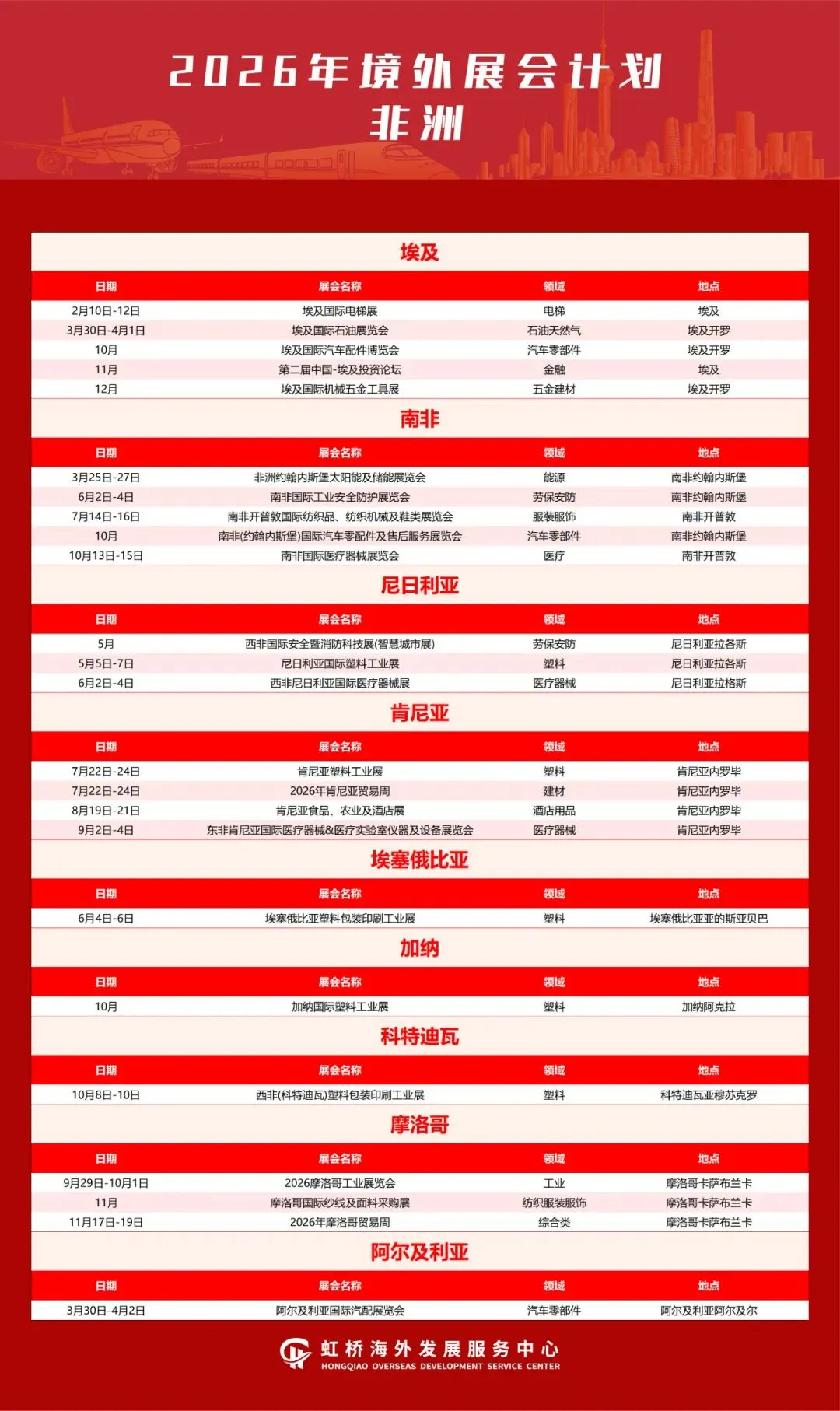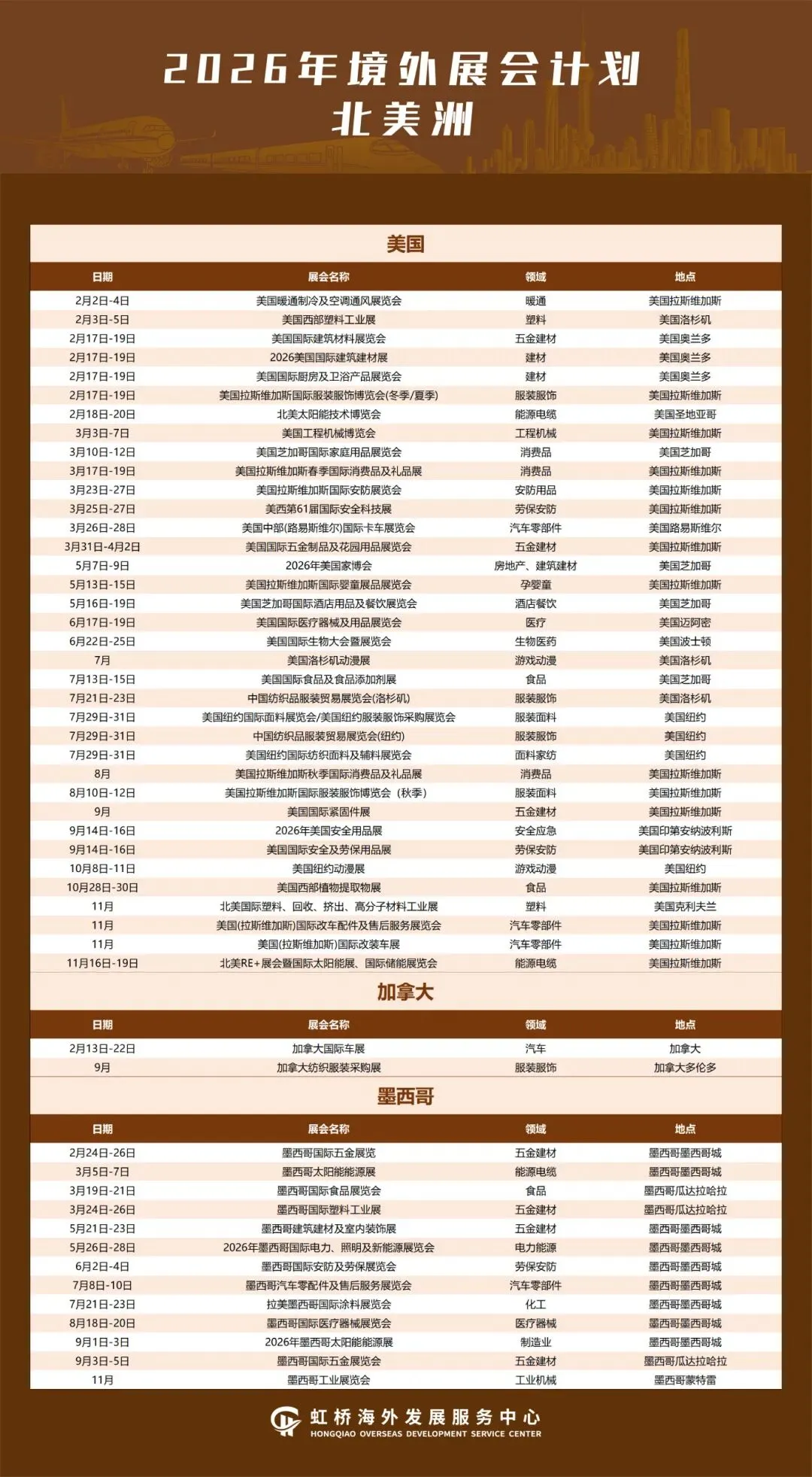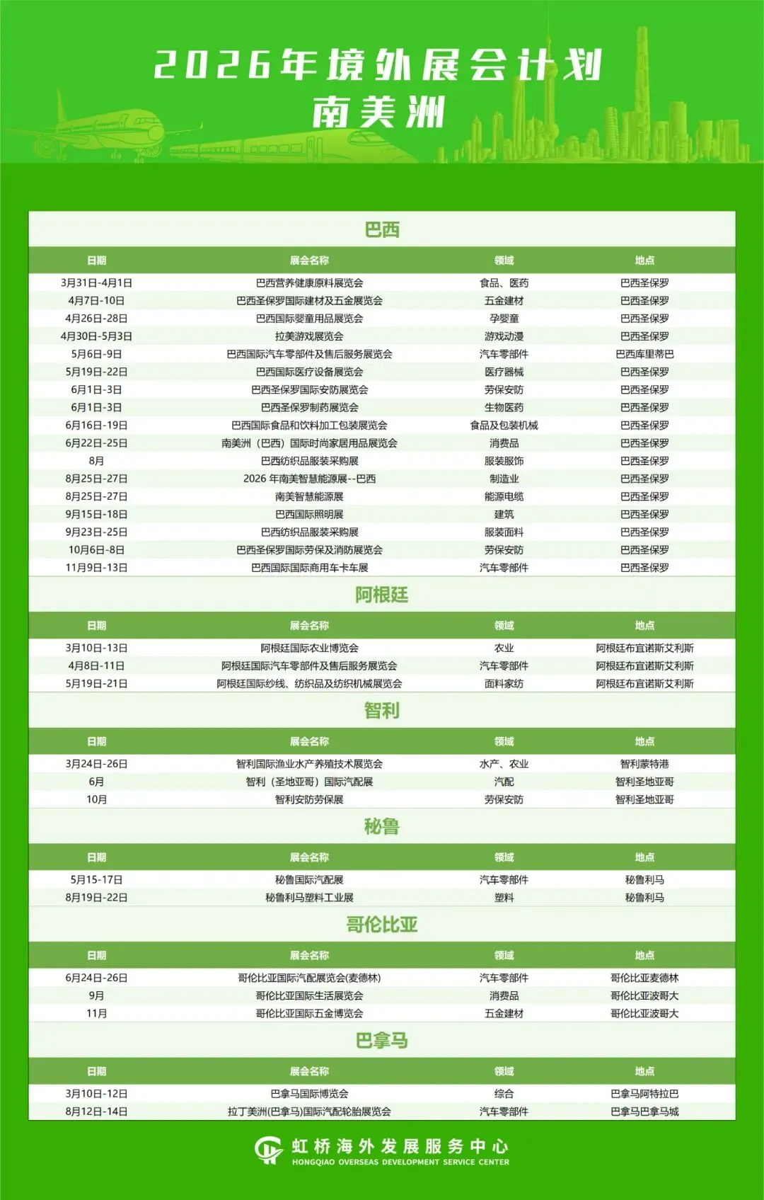 境外展会作为开拓国际市场和获取订单的重要来源,对外贸企业拓展市场、抢抓订单具有十分重要作用。为更大力度支持企业争取海外优质展会资源,扩大贸易机遇、拓展外贸市场,助力国际贸易中心提质升级,加快建设长三角企业走出去服务第一站,虹桥国际中央商务区梳理整合了2026年境外重点推荐展会,覆盖亚洲、欧洲、非洲、北美洲、南美洲、大洋洲等6大洲、56个国家/地区的408场专业展会,聚焦人工智能、生物医药、新能源等重点产业领域,助力企业精准对接国际产业前沿、深度参与全球专业交流、拓展多元国际市场。具体展会信息汇总如下: