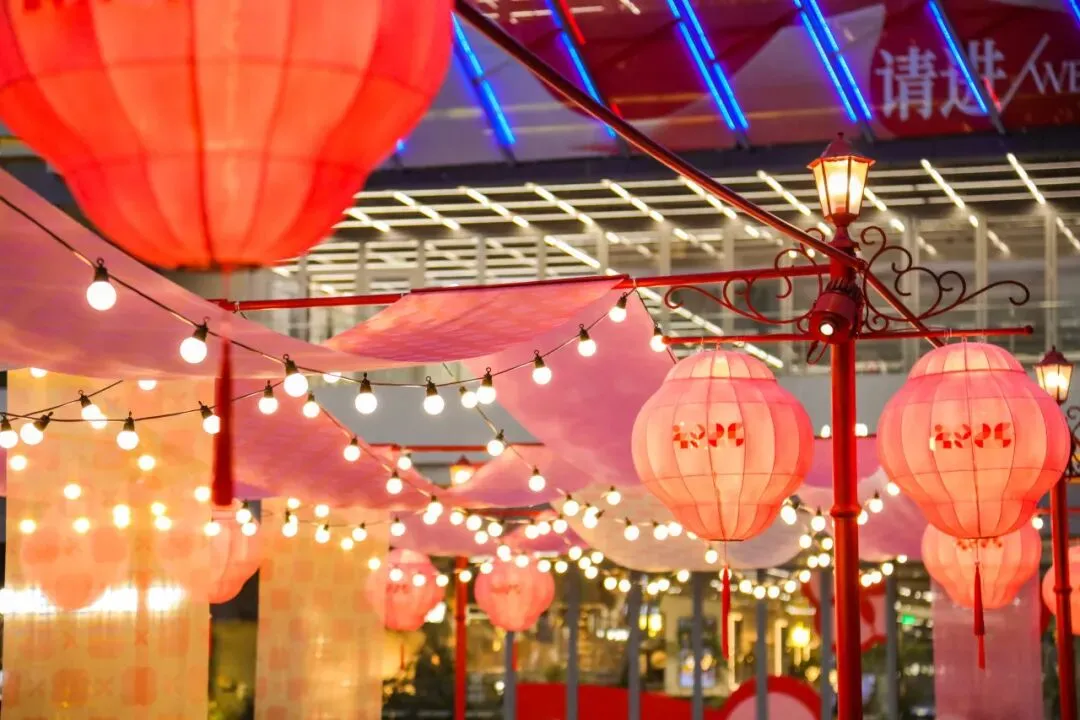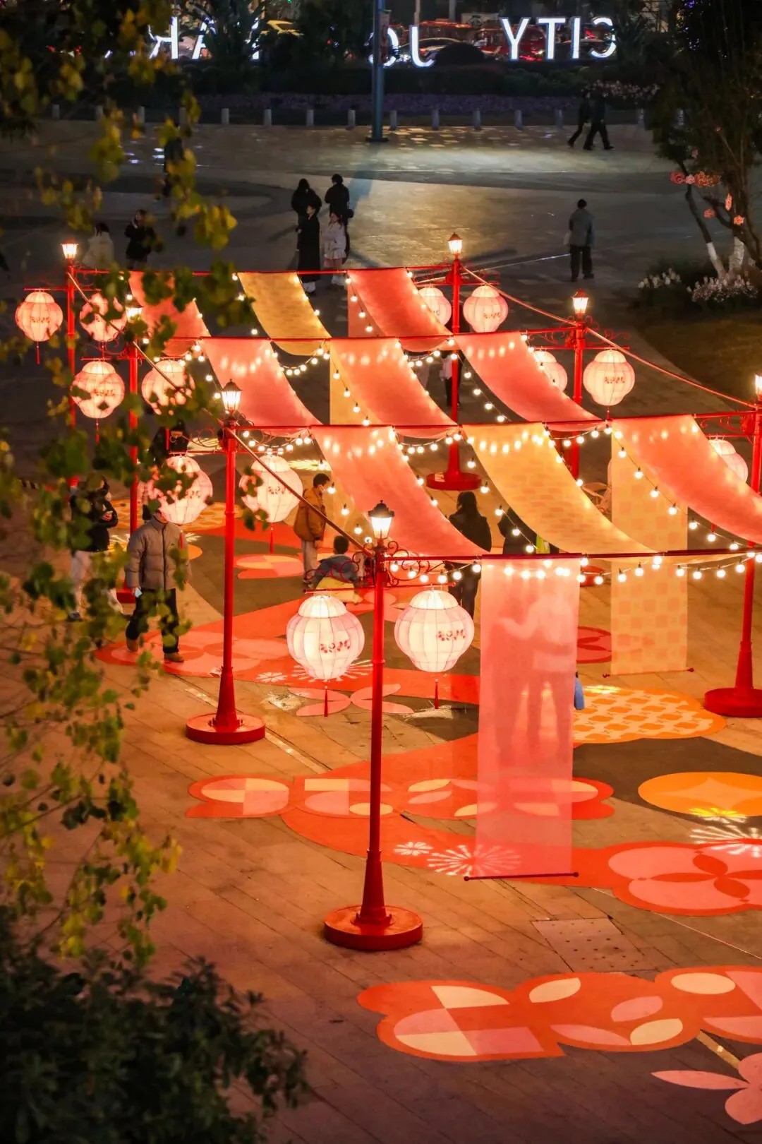 外广场上,新春灯笼搭配绚丽灯光,交织出一片温暖璀璨的红火光影,随手一拍便是年味满满的新春纪念。