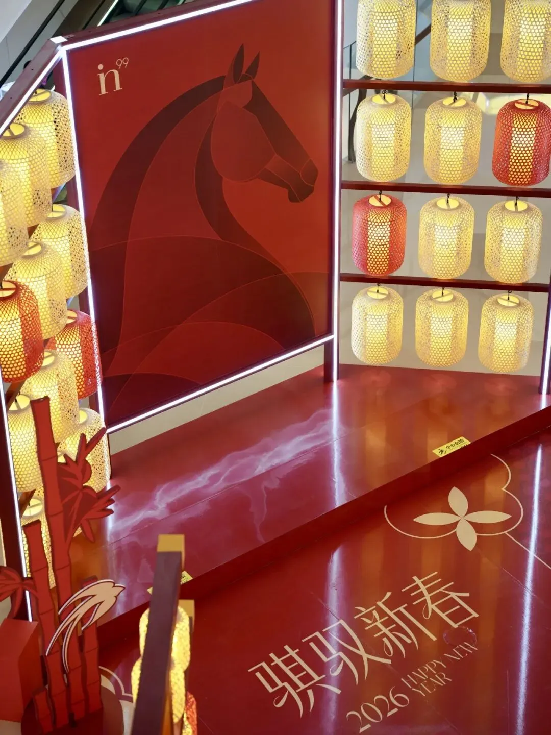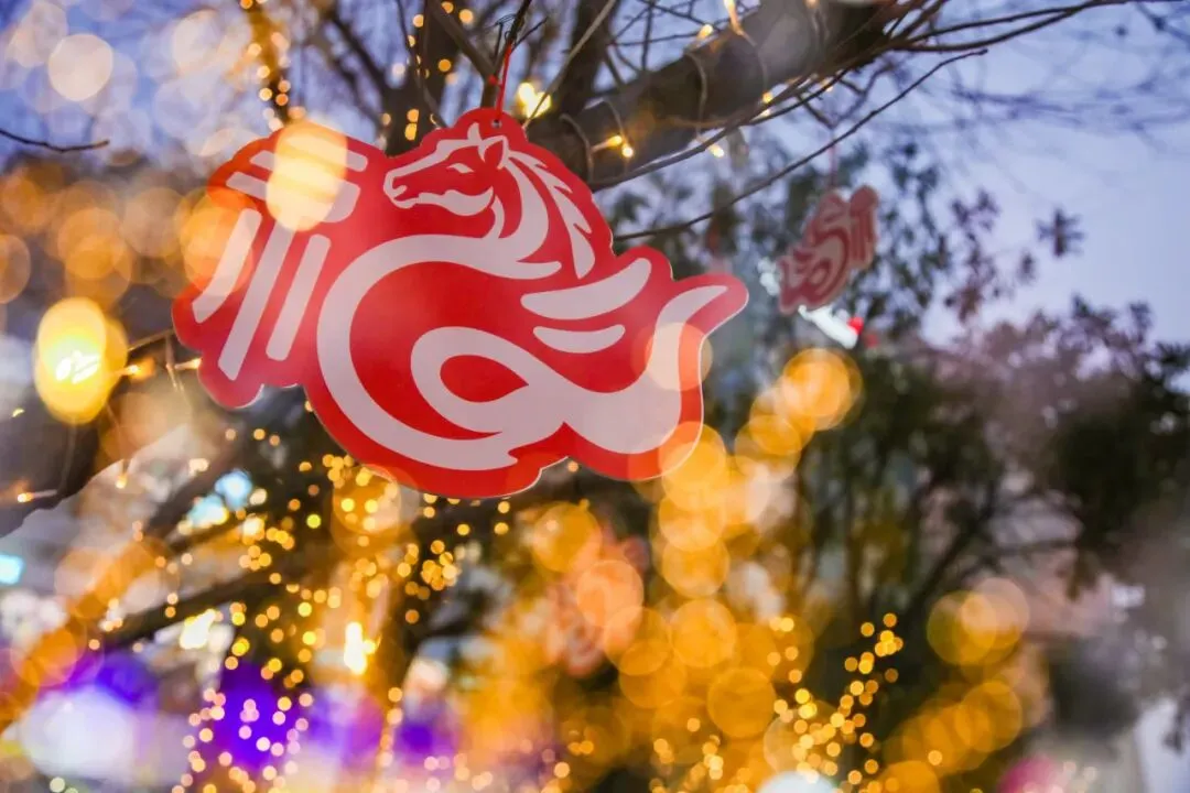 漫步其间,树上缀满以灵动“马”形演绎的定制福字,将传统祝福化为时尚符号,每一步都仿佛踏入精心预制的“新年大片”场景。