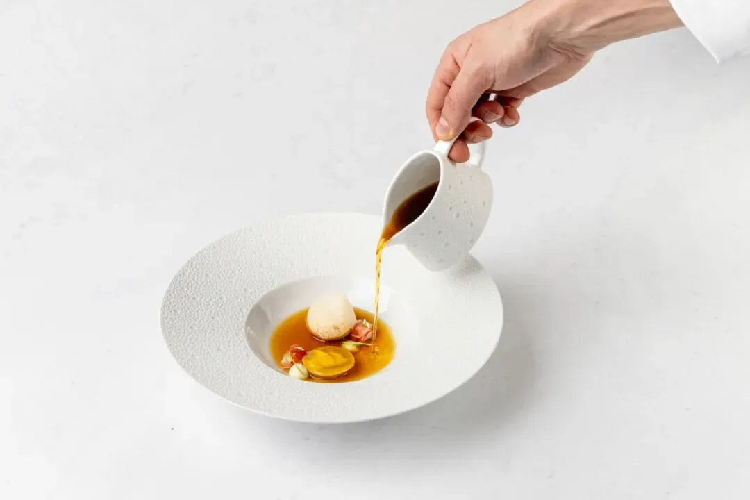 东亚的饮食文化,为主厨提供了无尽的创作灵感。「崇明鸽子,土豆,黑芝麻与木耳」,灵感源自首尔之行。韩式辣椒酱制成的黑芝麻泡沫,发酵黑豆酱调味的木耳意式奶冻,与高压慢煮的鸽腿巧妙结合。本地的崇明鸽经精准烤制,皮脆肉嫩,与充满韩式风味的元素交织,形成一道既熟悉又充满新意的料理,是主厨对亚洲发酵文化与烹饪技法的跨界表达。