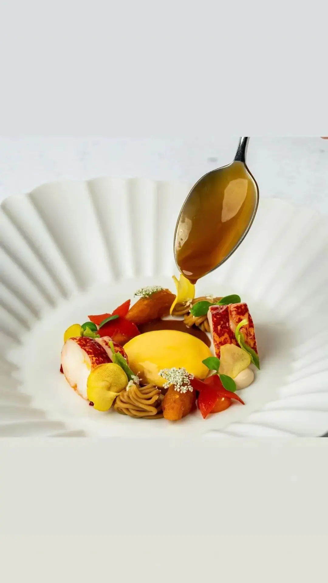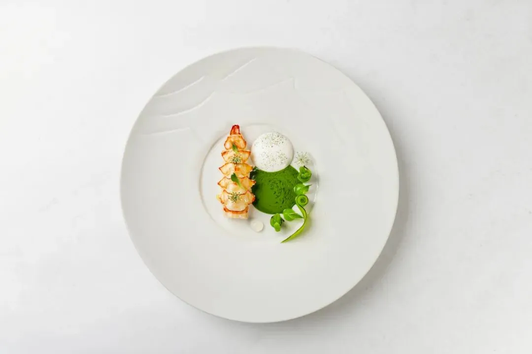凛冬时节,海味尤显珍贵。来自世界尽头的纯净海域,为餐桌带来第一重惊喜。「新西兰黑金鲍,洋姜,黑蒜与清酒黄油汁」将野生黑边鲍佐以清甜洋姜和黑蒜,点缀以蛤蜊清酒白汁,在凸显本味之余,更添东方调味哲学的婉约笔触;「新西兰海螯虾,椰浆与泰式绿咖喱,青笋与冰草」带来一场热带与寒带的共舞,0号野生海螯虾,其极致的清甜与细嫩,恰好承接了主厨记忆中曼谷绿咖喱的澎湃香草气息与辛辣层次。