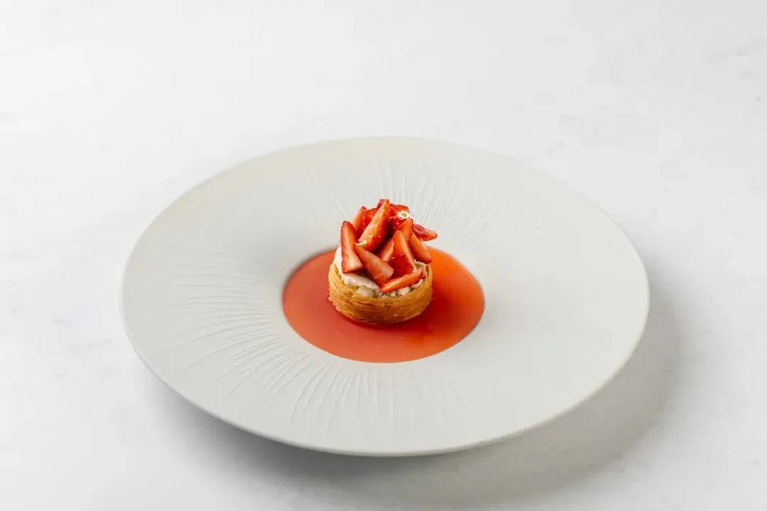 盛宴的终章回归至轻盈与愉悦。「千层酥,红颜草莓果酱,白奶酪香缇奶油,小米脆片与酸奶雪葩」,以酥脆千层承载着当季草莓的明媚果酸与白奶酪香缇奶油的顺滑香醇。