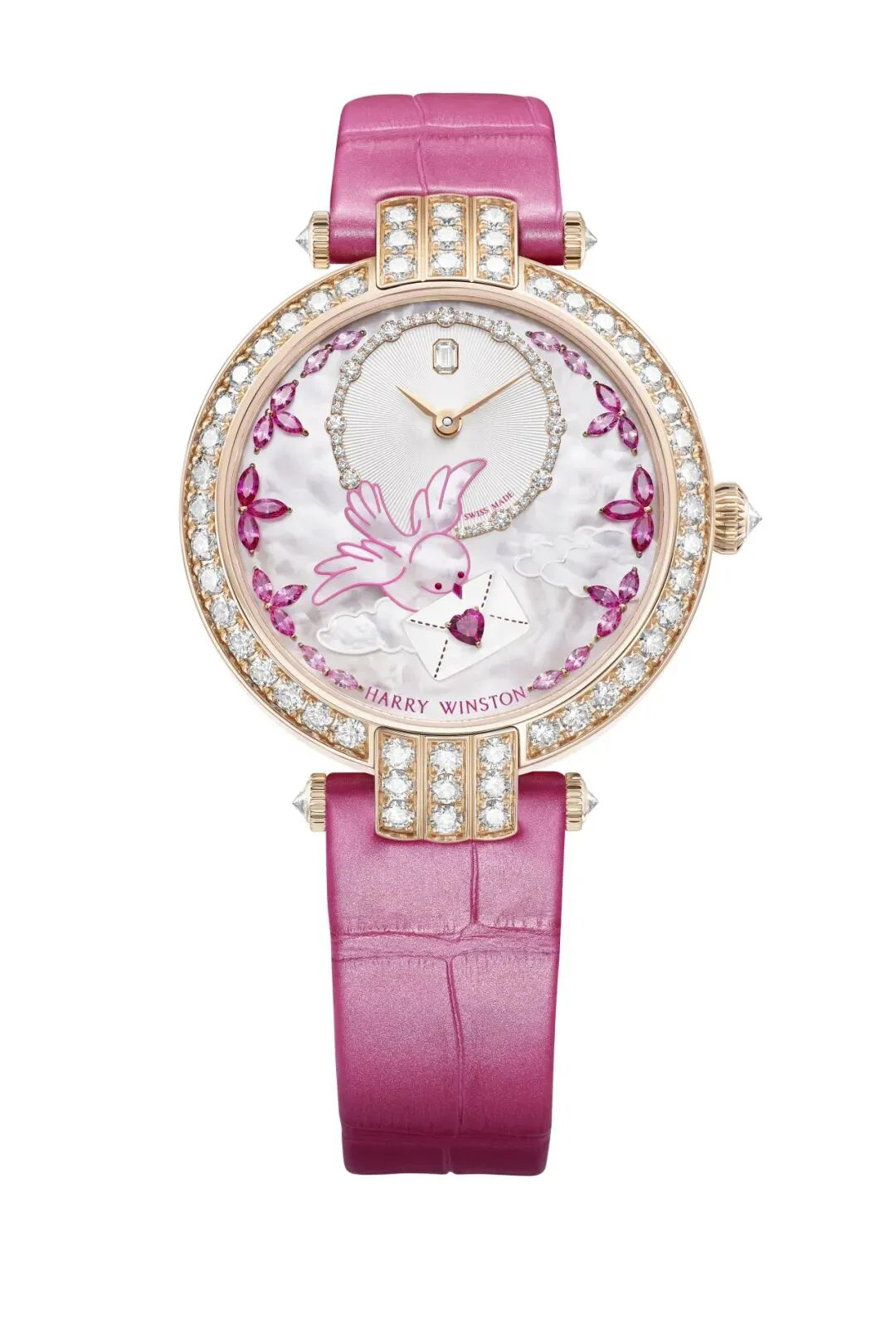 自2016年起,海瑞温斯顿每逢情人节便会推出一款风格别致的腕表。为延续这一传统,庆贺浪漫节日,卓时Premier系列推出一款限量版玫瑰金腕表。这款腕表探索了表达爱意的新方式,表盘上饰有一只承载着爱之讯息的小鸟。表盘采用海瑞温斯顿时计标志性材质打造,珍珠母贝散发出虹彩光泽,钻石和宝石则绽放着恒久光芒。