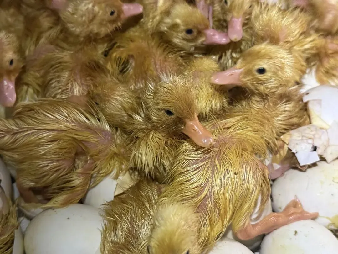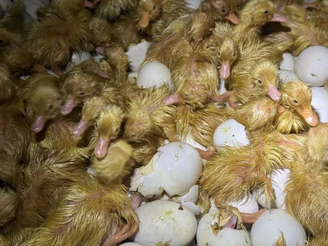 出雏区的景象尤为动人:刚破壳的雏鸭毛色嫩黄,浑身湿漉漉,一只只紧密地依偎在一起。张善青轻轻托起一只小鸭说:“等羽毛干了,它们就会被送往养殖户手中。”