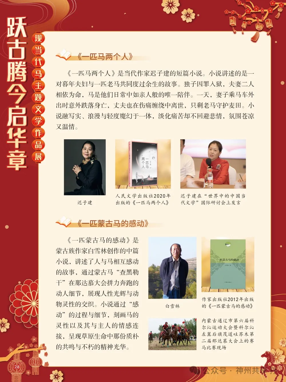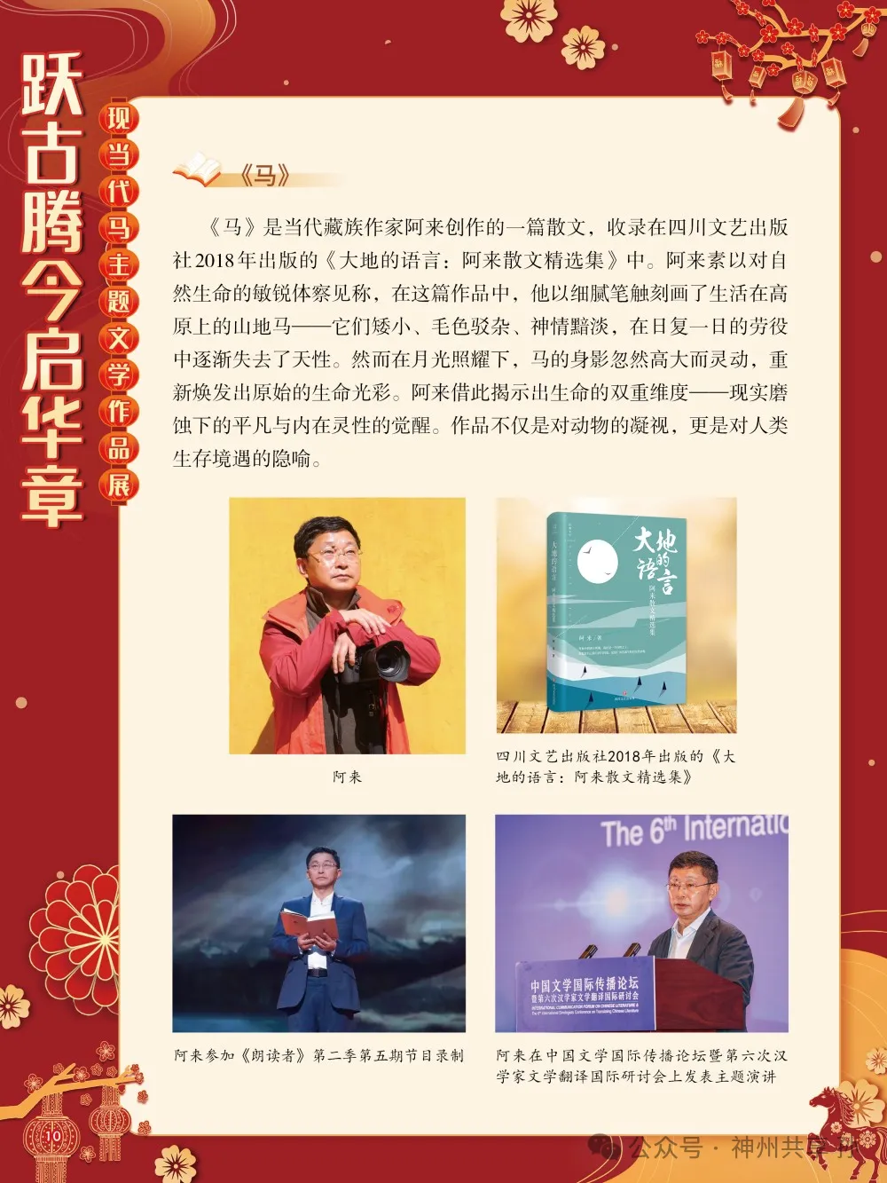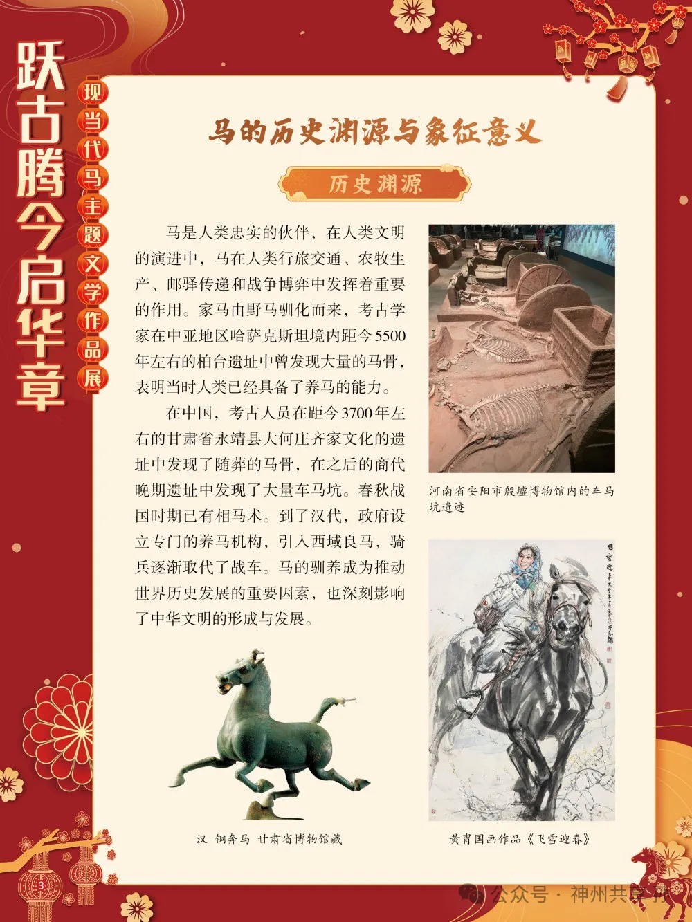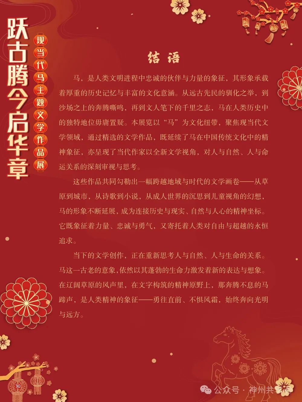 在现当代文学中,马的形象被赋予了更深层次的哲思与情感。它作为生命个体、精神图腾和情感载体,在广阔的文字世界里奔腾不息。“跃古腾今启华章——现当代马主题文学作品展”以马为线索,汇集现当代文学作品,带领大家一同走进这片文学的草原。愿马蹄的每一次腾跃,都能激发我们对生命的热爱与对自由的向往,引导我们感悟马的文化魅力,开启一段新的华彩篇章。