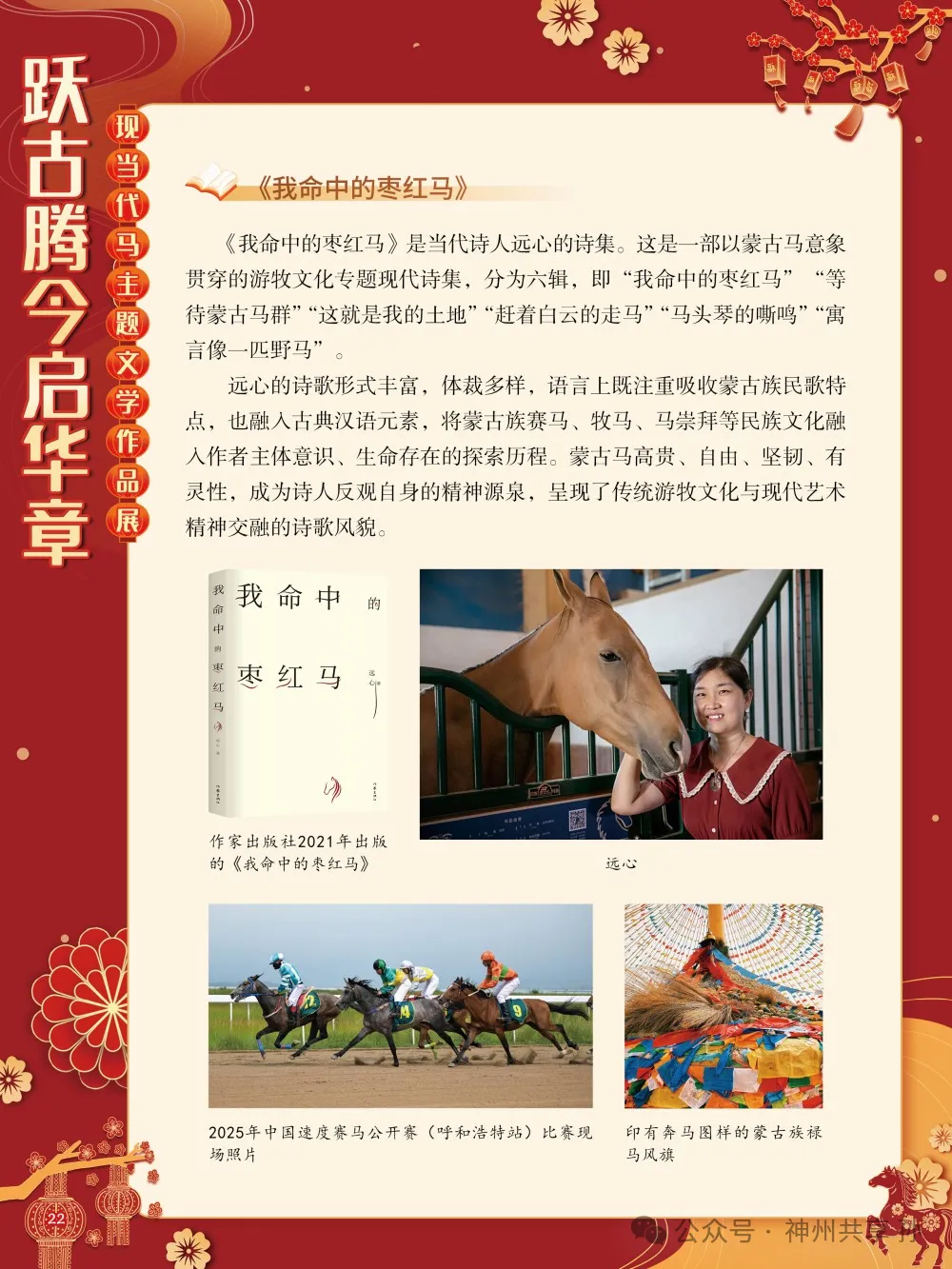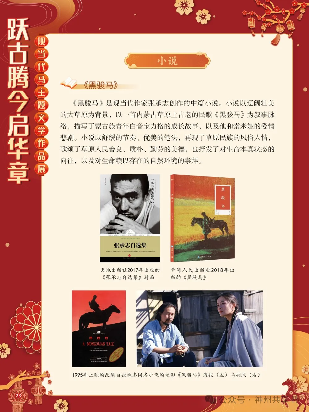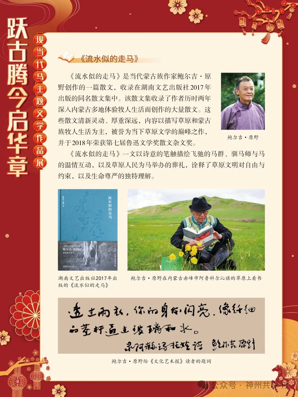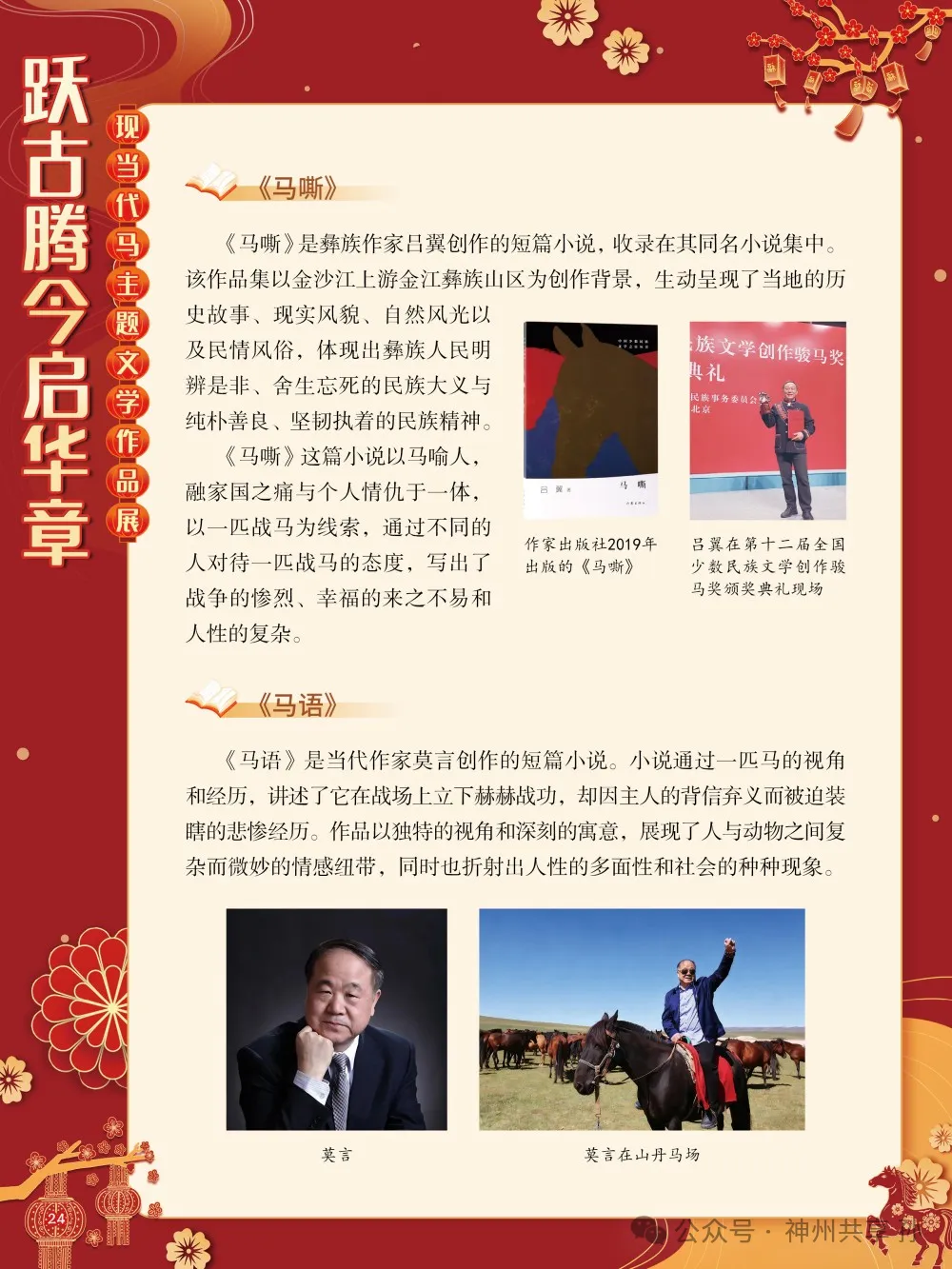 在现当代文学中,马的形象被赋予了更深层次的哲思与情感。它作为生命个体、精神图腾和情感载体,在广阔的文字世界里奔腾不息。“跃古腾今启华章——现当代马主题文学作品展”以马为线索,汇集现当代文学作品,带领大家一同走进这片文学的草原。愿马蹄的每一次腾跃,都能激发我们对生命的热爱与对自由的向往,引导我们感悟马的文化魅力,开启一段新的华彩篇章。