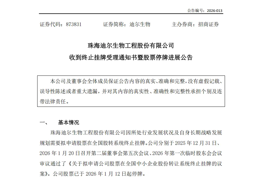2月12日晚间,迪尔生物一则公告悄然挂出。公司申请新三板终止挂牌已获全国股转公司受理,股票继续停牌。从措辞看,这是一条标准的程序性披露。但熟悉这家公司的人清楚,这纸公告背后,是一次并不常见的主动选择——在IVD行业从“规模扩张”滑向“周期调整”的当口,迪尔生物把脚从资本踏板收了回来。公告信息很简短。公司自1月12日起停牌,2月6日提交终止挂牌材料,2月12日确认获受理。主办券商仍是招商证券。关于退市原因,迪尔生物的表述只有一行:“因行业发展状况及自身长期战略发展规划需要”。没有更多解释,也没有常见的前往IPO铺垫。就像一个沉默的转身。如果说退市是战略层面的“舍”,那业务层面的“得”与“失”,半年报里写得很清楚。2025年上半年,迪尔生物营收1.02亿元,同比增长5.64%。数据不算差,但拆开看,冷暖不均。