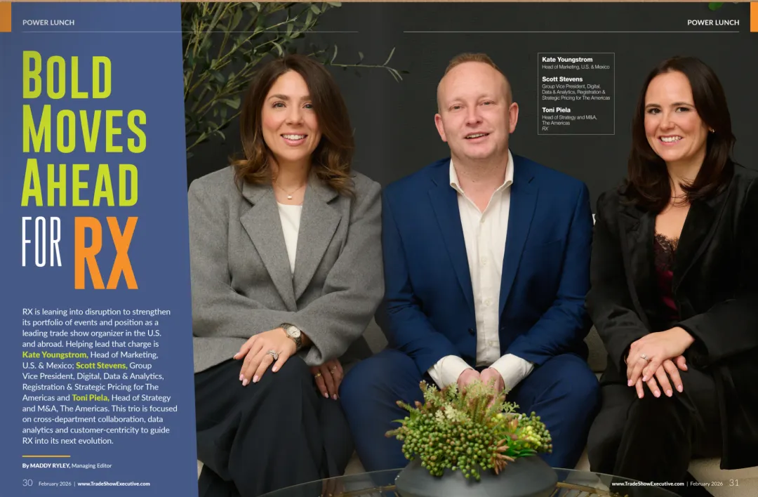 在 2026 年 2 月《Trade Show Executive》杂志的 “Power Lunch” 专题访谈中,励展博览集团(RX)美国区的三位核心领导者 —— 营销负责人 Kate Youngstrom、数字与数据分析副总裁 Scott Stevens、战略与并购负责人 Toni Piela,共同擘画了集团在会展行业变革浪潮中的战略蓝图,展现了其以颠覆式创新驱动未来发展的坚定决心。面对行业变革,励展博览集团美国正主动打破传统 B2B 会展的固有模式,以 “go try and break it”(大胆尝试、突破边界)的理念,推动团队跳出既有框架。集团强调营销决策需兼顾 “左脑(数据逻辑)” 与 “右脑(人文洞察)”,既通过数据分析识别注册趋势、渠道效能,又深度共情参展商与观众需求,将品牌融入其消费体验。正如 Kate 所说:“我们会问自己,注册趋势是什么?哪些渠道表现过强或过弱?客户反馈是什么?通过自问这些问题,我们赋能团队,让他们不再固守数月前写好的脚本。”通过培育 “颠覆被期待、被庆祝” 的企业文化,鼓励团队在项目中期灵活调整策略、大胆发声,避免被过往经验束缚。Scott 补充道:“我们有鼓励冒险的文化,我们会做出有策略的押注,以推动业务增长或提升行业影响力,我认为这也会带来一些积极成果,推动人们跳出舒适区,推动更好的结果。”集团鼓励员工主动承担风险、做出 “大胆押注”,通过有策略的试错实现业务增长,同时以积极成果推动行业突破舒适区。三位领导者一致认为,未来十年的会展行业将彻底告别 “八小时展厅静坐” 的传统模式,转向更具沉浸感、体验化与社交性的全新形态。仅靠展位与宣传册的时代已落幕,未来会展将强化体验元素,通过专家引导、沉浸式学习场景,让观众在短时间内高效获取价值。Toni 指出:“那些在展厅里坐八小时的日子一去不复返了。我们消费内容的方式正在改变,展会在与展厅的融合方面将变得更加沉浸式。”会展将深度整合学习、体验、商业与社交功能,打破展厅边界,让观众在不同主题与邻里场景中自由探索,最大化利用参会时间。Scott 强调:“我们需要思考如何最大化每个人在活动中的时间。不必将学习、体验、商业和网络分开,我们需要一次性完成。”观众参会的核心诉求从 “获取产品信息” 转向 “建立人脉、汲取灵感”,会展的终极价值将落脚于人与人的连接,而非单纯的交易。Kate 总结道:“人们来参加活动是为了他们在活动中建立的关系、离开时的关系以及带回业务的灵感。对我来说,活动的未来完全是关于联系和体验。”为实现上述愿景,励展博览集团美国对内部架构进行了重构,形成三大核心业务团队,以更灵活、更聚焦的方式推动战略落地:- 战略团队(Strategy Group):负责受众细分、价值主张开发、定位与 go-to-market 策略。