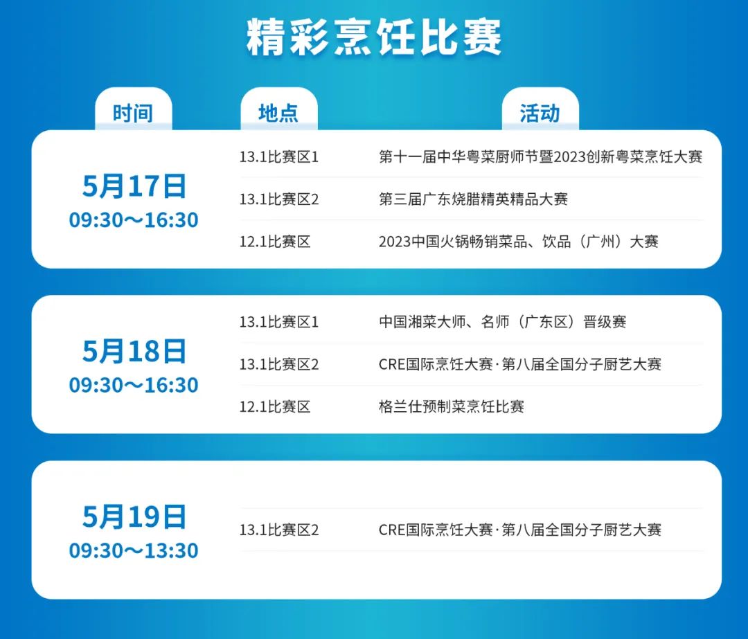 第十一届中华粤菜厨师节暨2023创新粤菜烹饪大赛 第八届全国分子厨艺烹饪大赛 第三届中国湘菜大师、名师(广东区)晋级赛 第三届广东烧腊精英精品大赛 中国火锅畅销菜品、饮品(广州)大赛 格兰仕预制菜烹饪比赛