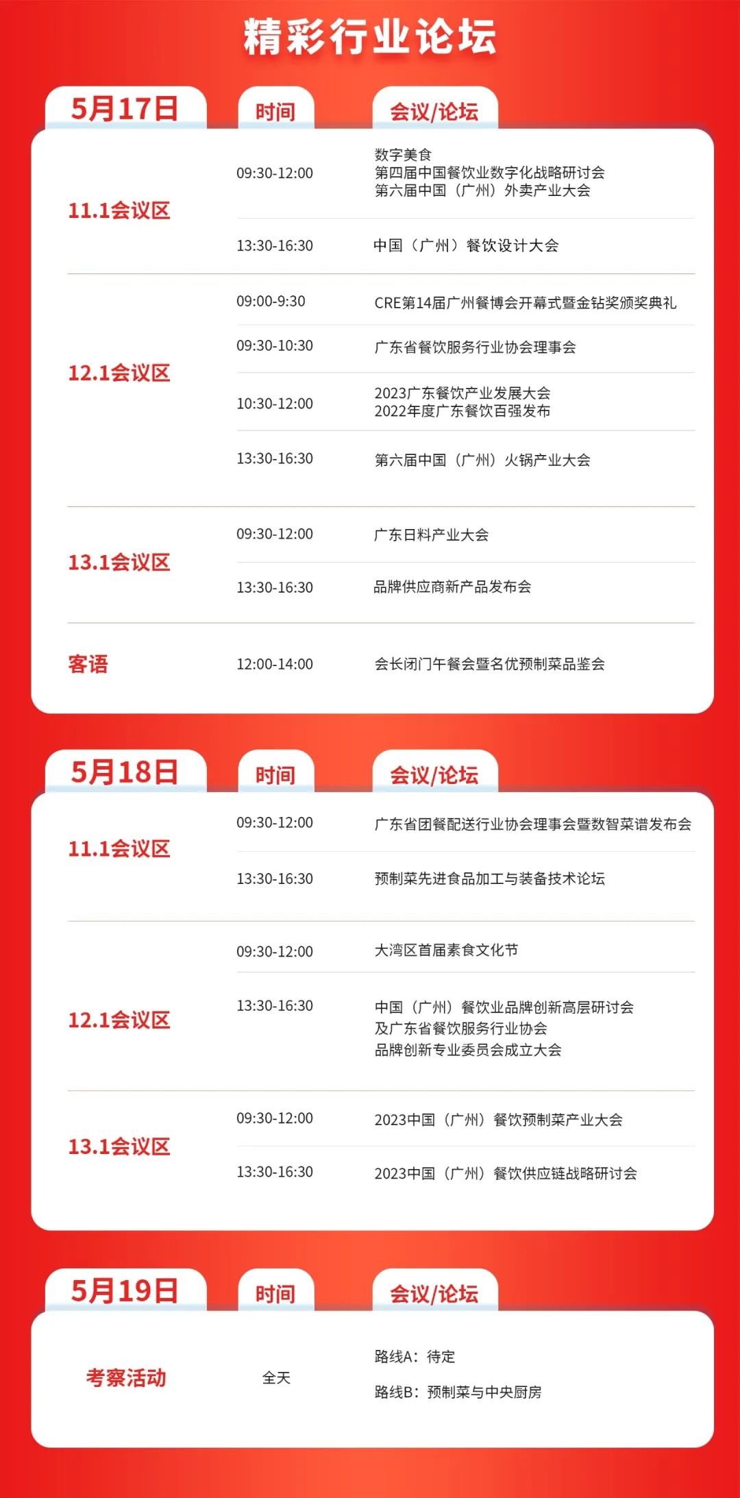 中国(广州)餐饮预制菜产业大会 数字美食丨第四届中国餐饮业数字化战略研讨会 第六届中国(广州)外卖产业大会 中国(广州)餐饮设计大会 第六届中国(广东)火锅产业大会 第七届中国日料产业大会 广东省团餐配送行业协会理事会暨数智菜谱发布会 预制菜先进食品加工与装备技术论坛 大湾区首届素食文化节 中国(广州)餐饮业品牌创新高层研讨会及广东省餐饮服务行业协会品牌创新专业委员会成立大会 2023中国(广州)餐饮供应链战略研讨会 CRE第14届广州餐博会开幕式 广东省餐饮服务行业协会理事会 会长闭门午餐会暨名优预制菜品鉴会 品牌供应商新产品发布会 新食材、新技术、新营销、新地产专场路演