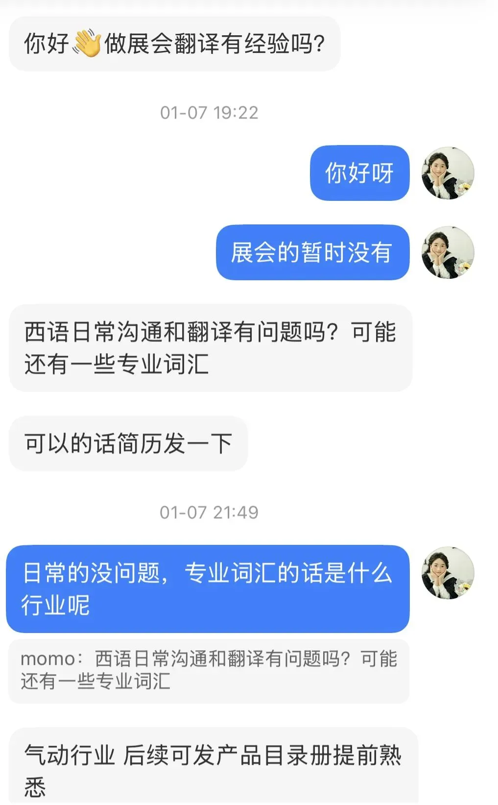 事情要从一个月前说起,那天我照例躺在床上刷小红书首页推送了一条招展会翻译的帖子,我点进去评论了一句“我!”,没想到居然有后续?