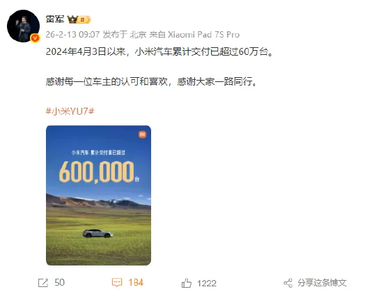 2月13日消息,小米创办人,董事长兼CEO雷军发文表示,2024年4月3日以来,小米汽车累计交付已超过60万台。感谢每一位车主的认可和喜欢,感谢大家一路同行。