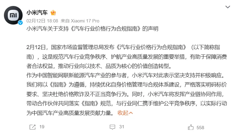 2月12日,小米汽车微博发布关于支持《汽车行业价格行为合规指南》的声明: