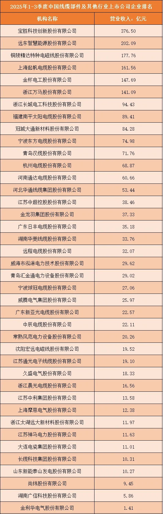 根据申万行业分类,2025年1-3季度中国线缆部件及其他行业上市公司按营业收入排名如下:(A股上市公司)