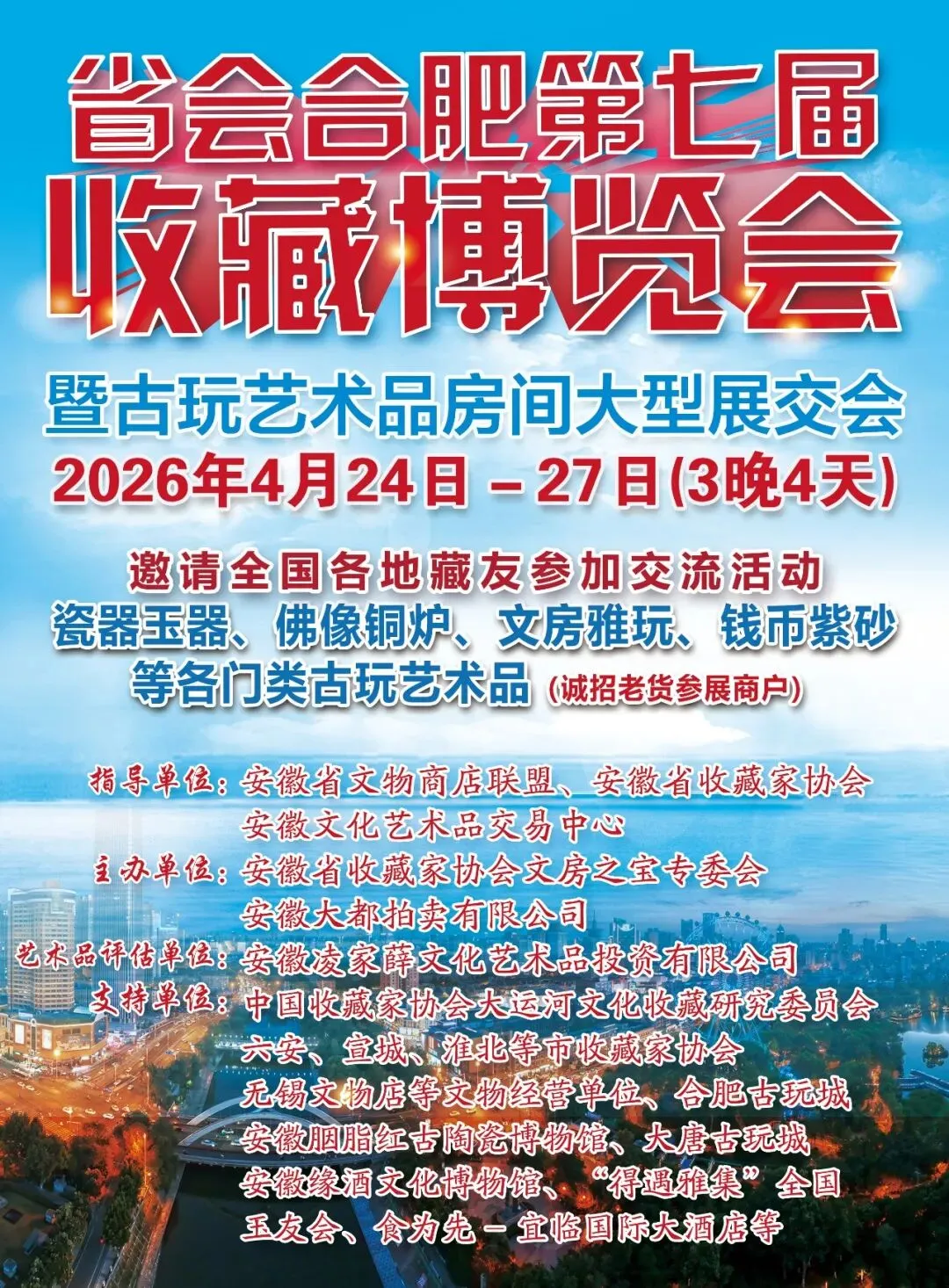 2026年4月24日将开启新一线城市霸都合肥第七届收藏文旅博览会暨古玩艺术品大型房间展览交流会,本次博览会采取公益鉴宝、价格评估、雅集沙龙、专题展、拍卖会、拍品征集、展厅交流、房间交流于一体模式。参会的藏家、行家、收藏爱好者众多,现诚邀全国收藏组织、文物公司、民间博物馆、古玩店家、收藏爱好者于霸都雅聚,相互交流,携手并进(诚招老货参展商户)。