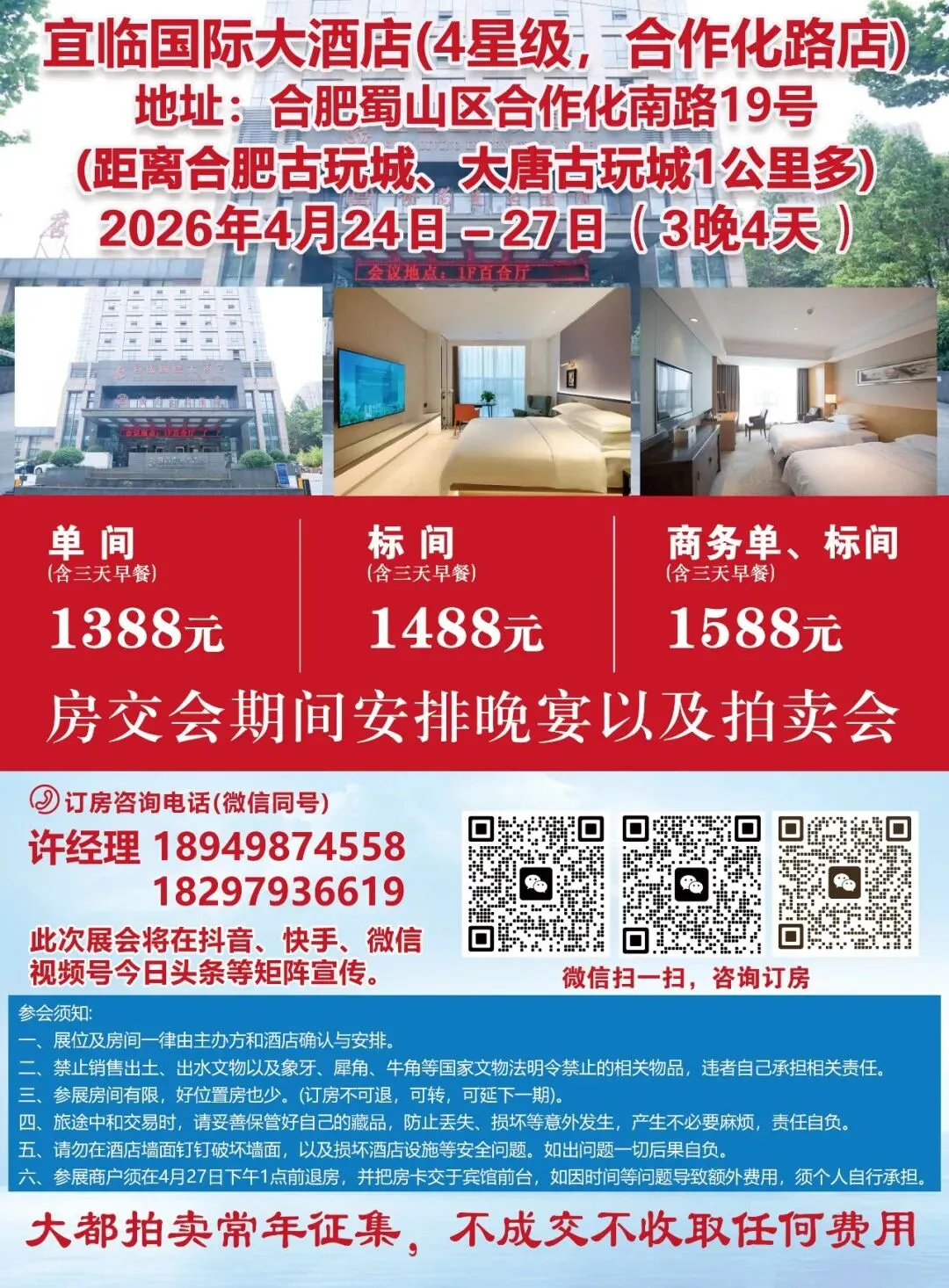 四、旅途中和交易时,请妥善保管好自己的藏品,防止丢失、损坏等意外发生,产生不必要麻烦,责任自负。五、入住商家须在4月27日下午1点前退房,并把房卡交于宾馆前台,如因时间等问题导致额外费用,须个人自行承担。