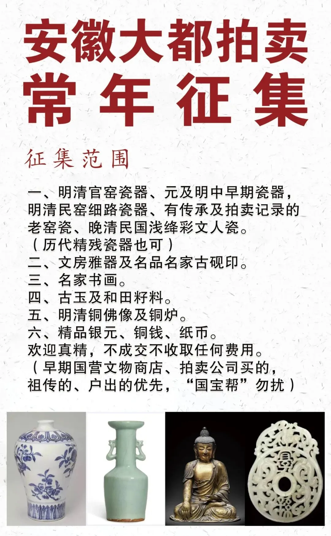 瓷器玉器、佛像铜炉、文房雅玩、钱币紫砂、竹木印石等各门类古玩艺术品(诚招老货参展商户)。