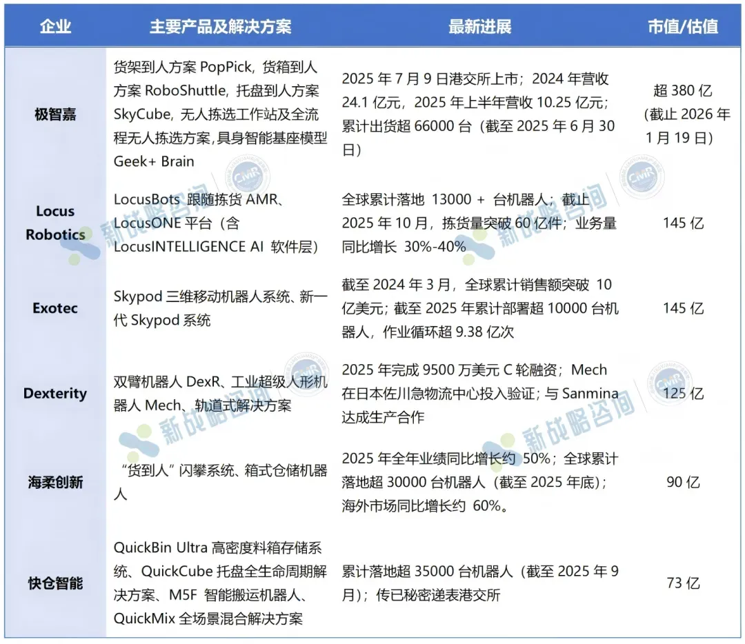 2025年6月,胡润研究院发布的《2025全球独角兽榜》显示,截至2025年1月1日,移动机器人领域(工业及仓储物流)共有6家独角兽企业,分别是:极智嘉、Locus Robotics、Exotec、Dexterity、海柔创新、快仓智能。其中,海柔创新估值90亿元,略高于快仓智能的73亿元。