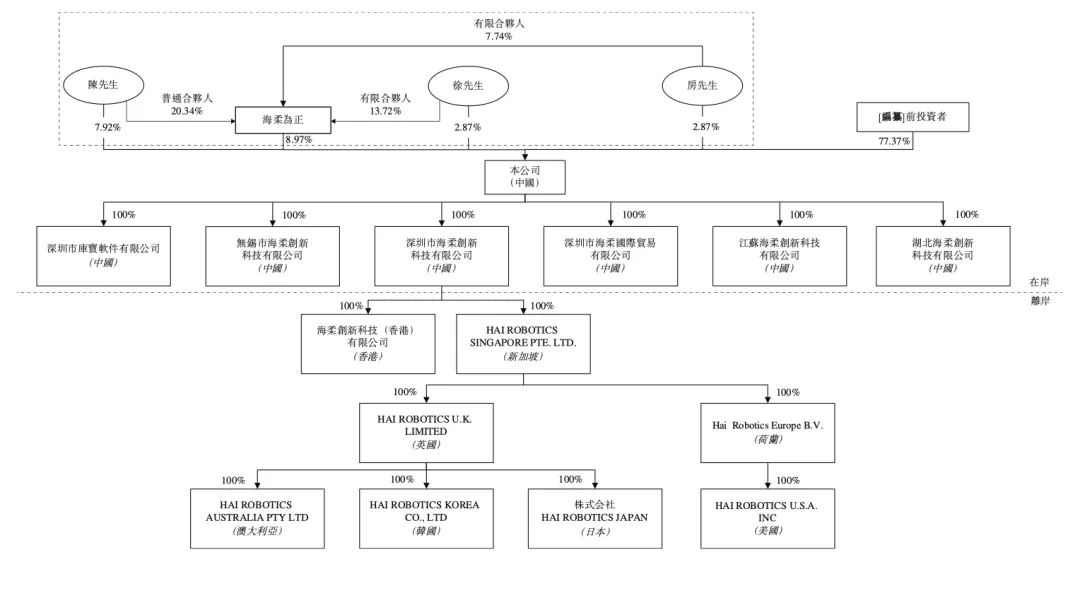 IPO前,陈宇奇直接持有海柔创新7.92%股份,有63.23%投票权,徐圣东、房冰分别持股2.87%,有1.14%投票权,三人为一致行动人士;员工持股平台海柔为正持股8.97%,有3.58%投票权。