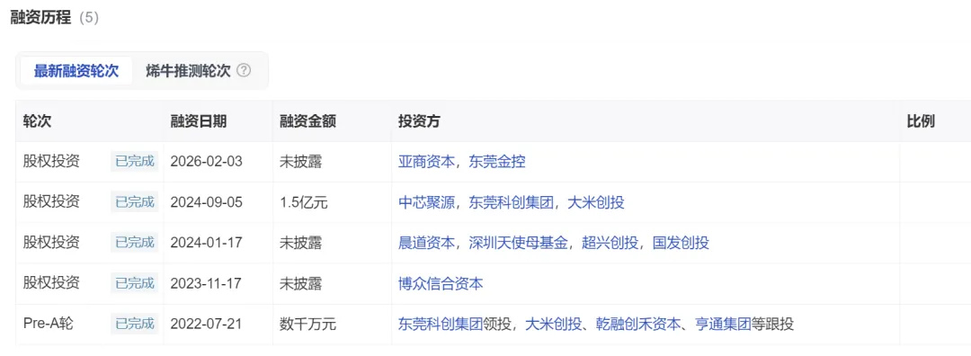 根据烯牛数据库显示,公司已经完成5轮融资,吸引了东莞科创集团、大米创投、亨通集团、博众信合资本、晨道资本、深圳天使母基金、超兴创投、国发创投、中芯聚源等众多投资机构。本文参考: