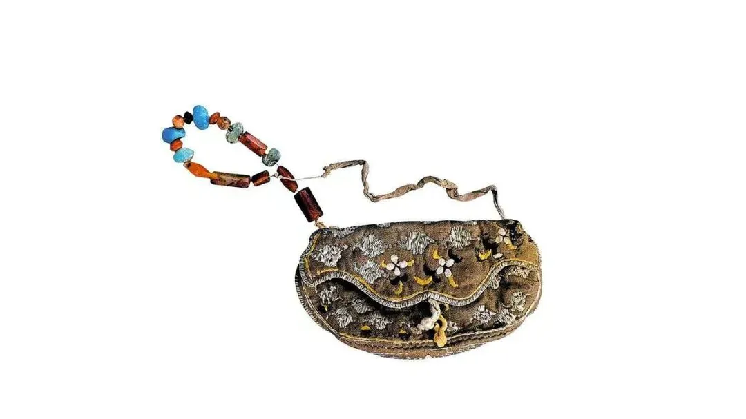 《千岁香包》采用黄褐色织锦缝制,呈荷叶盖手包形,配玛瑙宝石带链,运用锁边、十字针等传统工艺,主体刺绣海棠花纹样,底部隐现莲花纹,历经千年仍色泽艳丽。其纹饰与形制体现了佛教文化内涵,被认定为庆阳香包民俗文化的起源代表,是我国现存最完整的早期香包实物,现为国家一级文物,藏于华池县博物馆。