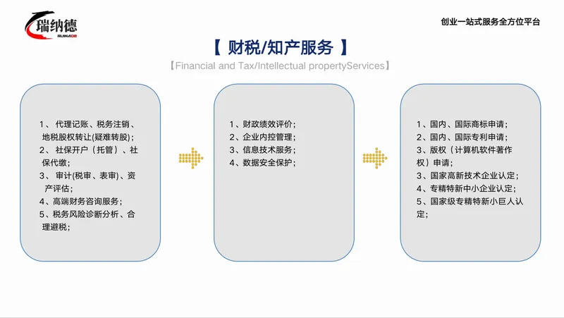 瑞纳德企服秉承“安全你的创业 助你创业成功”的服务宗旨,通过结合“互联网+”理念整合更多优秀创业服务机构,力求更大能力的帮助更多中小微企业和创业团队提供出专业、安全、高效的创业财务服务,助力国家双创工作。