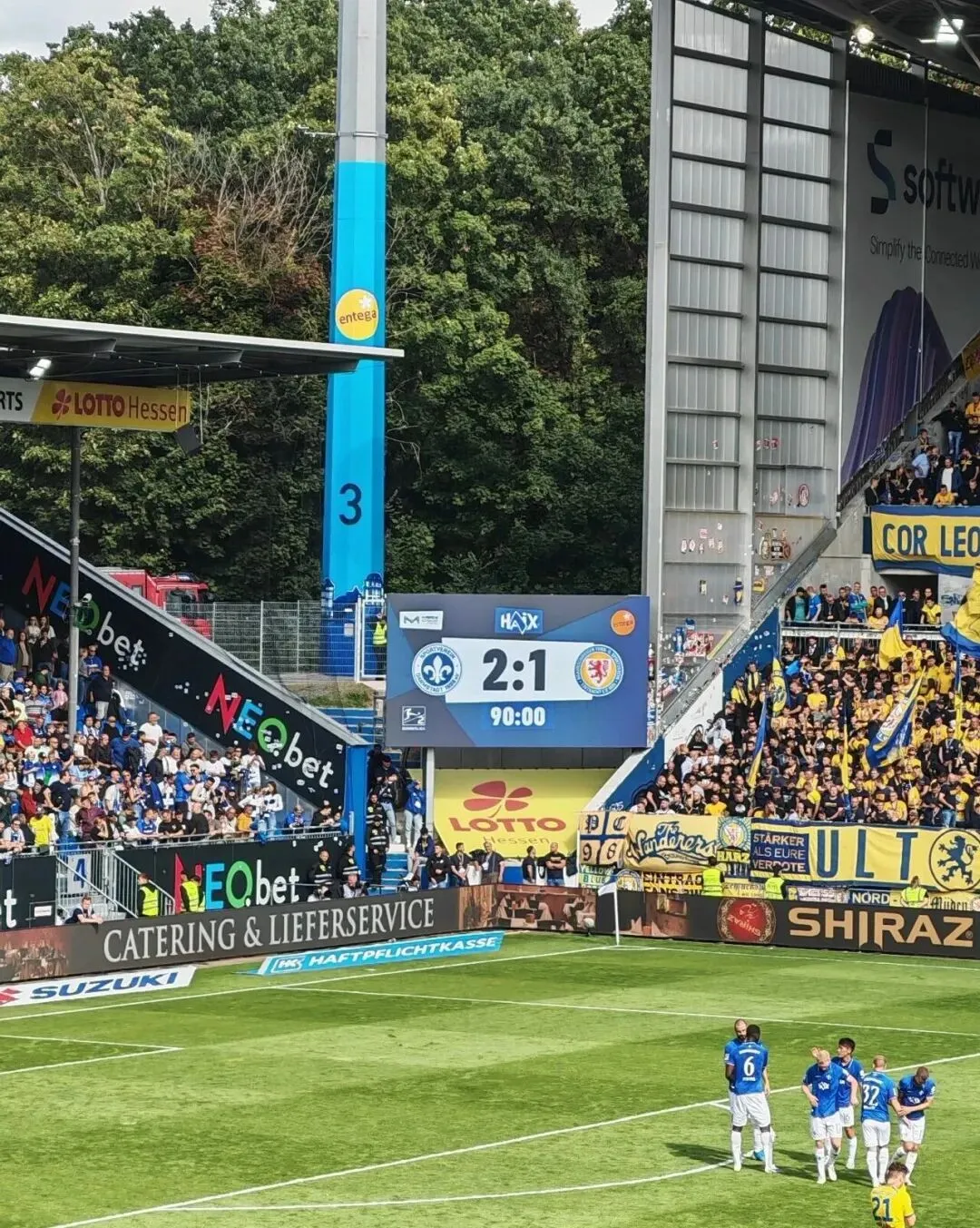 “必须在VIP区看!这是我们主场的‘最高礼仪’。”Y在邮件里坚持。于是9月的德国午后,我抱着“看球顺便谈事”的心态走进球场。这个是VIP区的自助餐。“我们支持的达姆施塔特98队,今天要赢!”Y拍着我肩膀,啤酒杯里的泡沫溅出几滴。可开场15分钟,客队就进了球(24分的时候,还是0:1)。我偷偷瞄了眼Y紧绷的侧脸,心里打起小鼓:要是主队输了,下午的新项目还怎么聊?旁边的德国同事却突然笑出声:“别紧张,德国人的合作和球赛一样,不到终场哨永远有机会。”话音刚落,主队前锋突然一脚抽射——球进了!整个球场像被点燃的炸药桶。客户激动地拥抱我的德国同事,啤酒洒了半杯在西装上也毫不在意。那一刻我突然明白:在德国,商务合作从来不止是合同上的条款,更是这种“同频共振”的情感联结。▍嘈杂看台上的“静音谈判”