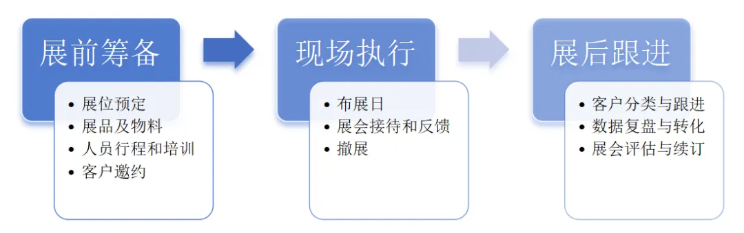 整个展会流程,实质上是推动客户经历“成交三阶段”的加速器: