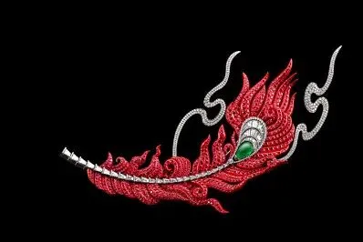 红宝石铺陈出凤羽烈焰般的光彩,凤翎眼上点缀有一颗7.77克拉的水胆形祖母绿,特殊阶梯式和明亮式切割的白钻构成羽毛的羽根和羽茎。