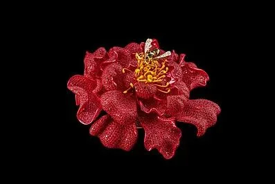 牡丹胸针以8000颗、总重156克拉的红宝石呈现牡丹的盛放之姿,将属于东方的沉静与丰盈化作永恒。精心镶嵌的宝石铺陈出牡丹叠映的花瓣,层层递进至花心。隐蔽的花朵底部选用近2000颗、共计19.65克拉的祖母绿构成萼片的精致细节。花心处停驻的蜜蜂,是一件诞生于百余年前法国的历史珠宝,如今被收入V MUSE珍藏。