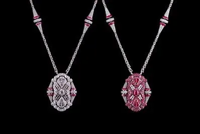 装饰艺术风格吊坠是V MUSE向“装饰艺术运动”一百周年致敬的原创高级珠宝作品。吊坠正背面分别镶嵌品质上乘的钻石与红宝石,对比鲜明的色彩与几何线条充分体现“装饰艺术运动”的灵感渊源。