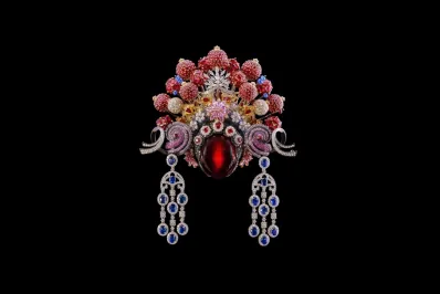刀马旦最具识别性的头面元素——七星额子,以密集而严谨的宝石布局加以呈现:总重92.42克拉的1193颗红宝石以圆形、椭圆、马眼、公主方、水滴切面等各种形态交错镶嵌,模拟戏曲头饰中流苏、绒球、簪花等物件,玲珑有致,富于动感和层次;大量钻石、粉色蓝宝石和蓝宝石装饰于“盔头”与“额头”,营造出华丽而张扬的戏曲舞台效果;“盔头”两侧的流苏是源自装饰艺术风格的可拆卸吊灯耳环。