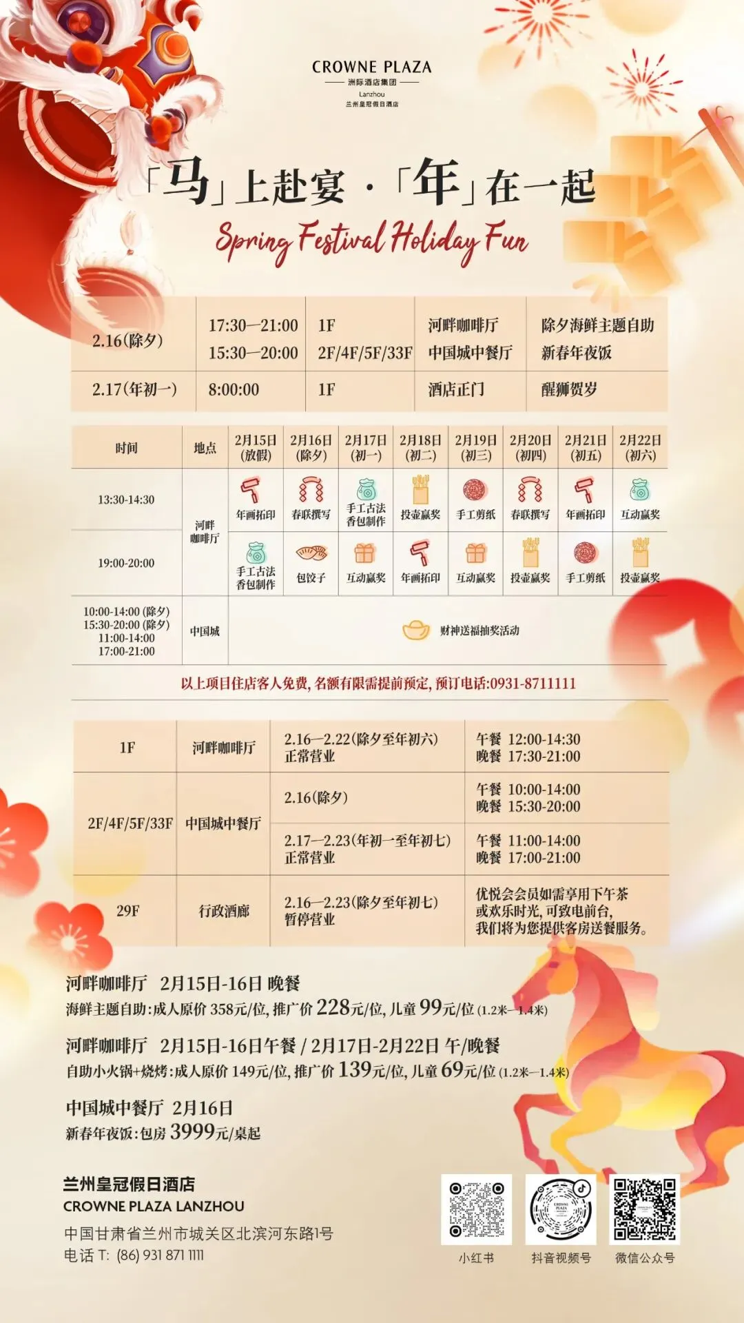 ? 马年新春已至,年味拉满全城!不想远行堵在路上,又想解锁不一样的春节乐趣?这份超全游玩指南请收好,甘肃电投会展集团旗下兰州皇冠假日酒店、甘肃国际会展中心、甘肃大剧院,从正月初一到元宵佳节,遛娃、约会、全家欢聚、解压休闲一站式搞定,承包您整个春节的欢喜与仪式感!