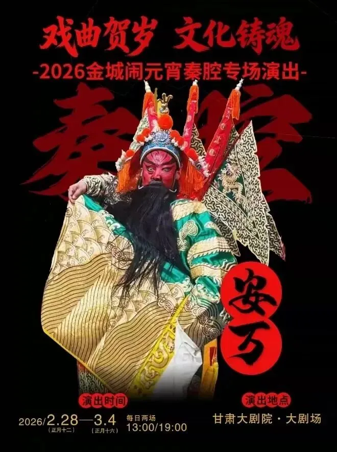 春节的欢喜,延续至元宵佳节!(2月28日-3月4日,正月十二至十六),“戏曲贺岁 文化铸魂”2026金城闹元宵秦腔专场演出,将在大剧院隆重开演。板胡铿锵,秦腔悠扬,安万携众弟子及西北秦腔名家轮番登台,一招一式尽显功底,婉转唱腔萦绕全场,在传统文化的浸润中,为这个马年春节画上圆满句号,戏迷朋友们千万别错过这场视听盛宴!
