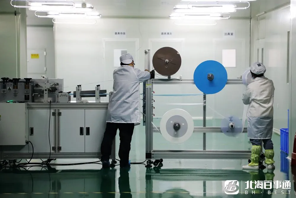 进入公司后,我们首先看到的是一个口罩生产车间,小编透过密闭的玻璃窗往里张望,看到有5、6名穿戴好防护衣物的工作人员正在里面忙活。相关负责人告诉小编,此时车间内正是3月4日投产的首条生产线。