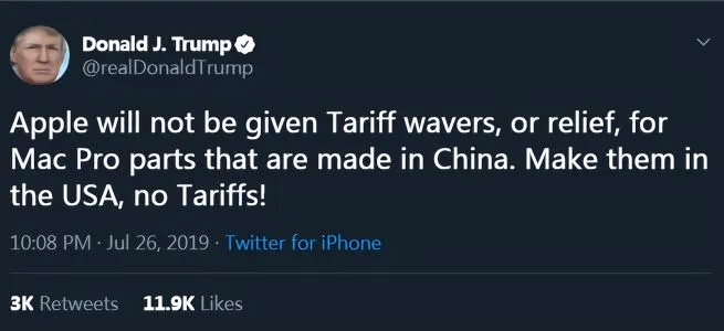 当地时间26日上午10点,特朗普通过社交媒体发声,“苹果在中国生产Mac Pro的零件,不会得到关税豁免、减免。在美国造,就不用关税!”
