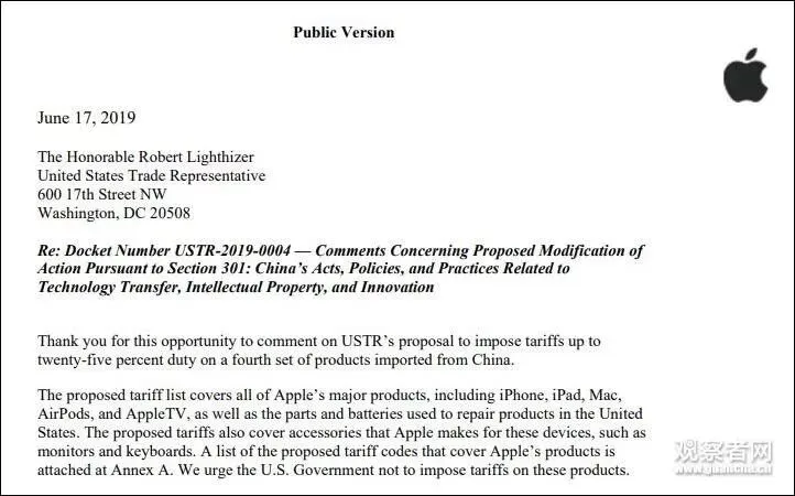 苹果公开声明反对对华加收关税