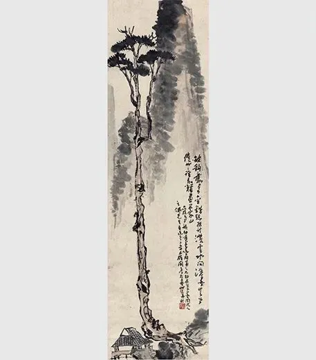 潘天寿《松横翠微图》这幅作品中,松树那钢筋铁骨般的屹立姿态让人过目难忘。在2017年中国美术馆举办的“民族翰骨——潘天寿诞辰120周年纪念大展”中,展墙上曾写道:“他的笔墨是对于文人画末流轻秀促弱之风的反拨,是对汉魏碑刻所记录的远古雄风的追慕。”
