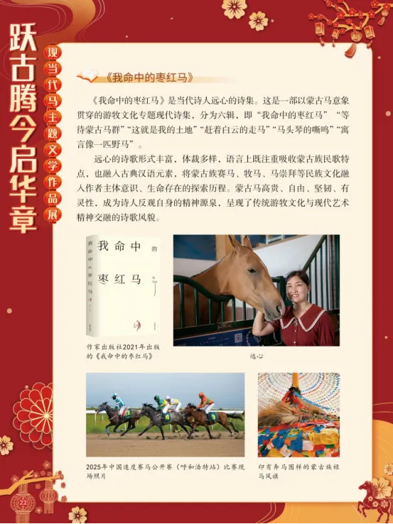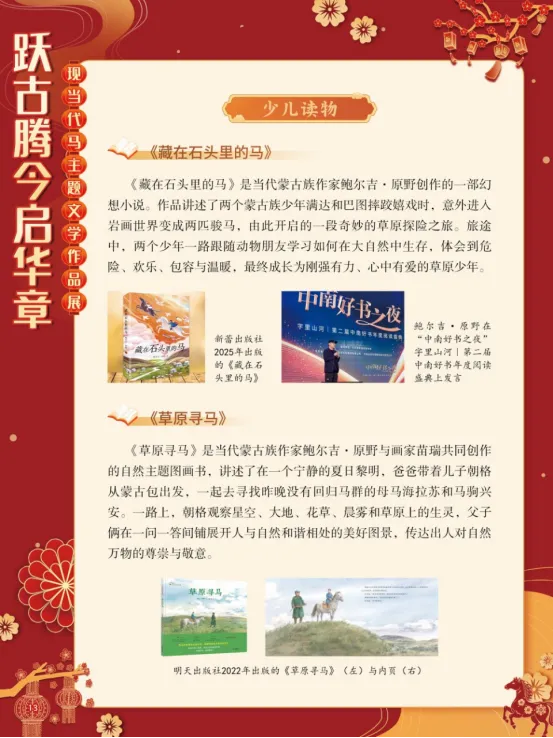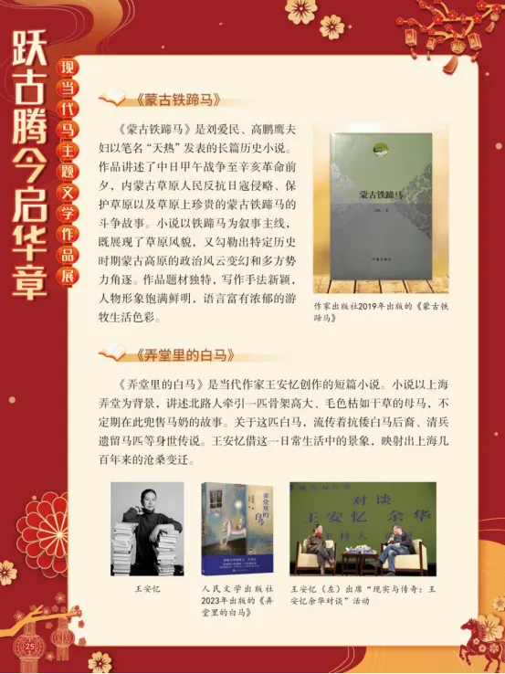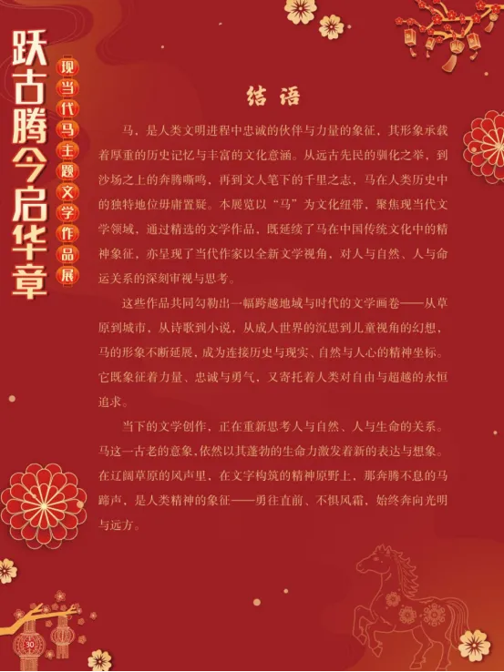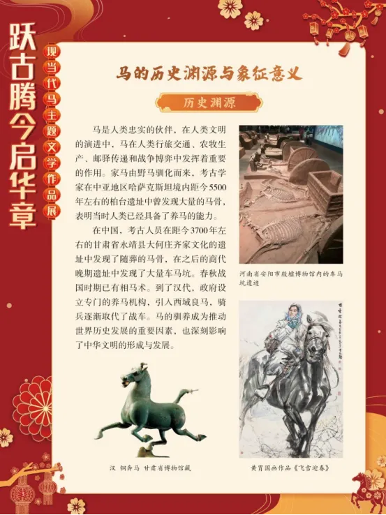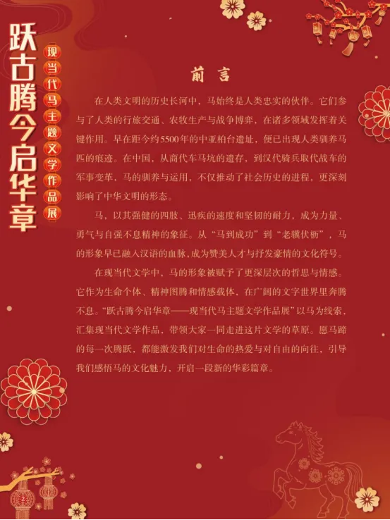 在人类文明的历史长河中,马始终是人类忠实的伙伴。它们参与了人类的行旅交通、农牧生产与战争博弈,在诸多领域发挥着关键作用。早在距今约5500年的中亚柏台遗址,便已出现人类驯养马匹的痕迹。在中国,从商代车马坑的遗存,到汉代骑兵取代战车的军事变革,马的驯养与运用,不仅推动了社会历史的进程,更深刻影响了中华文明的形态。马,以其强健的四肢、迅疾的速度和坚韧的耐力,成为力量、勇气与自强不息精神的象征。从“马到成功”到“老骥伏枥”,马的形象早已融入汉语的血脉,成为赞美人才与抒发豪情的文化符号。在现当代文学中,马的形象被赋予了更深层次的哲思与情感。它作为生命个体、精神图腾和情感载体,在广阔的文字世界里奔腾不息。“跃古腾今启华章——现当代马主题文学作品展”以马为线索,汇集现当代文学作品,带领大家一同走进这片文学的草原。愿马蹄的每一次腾跃,都能激发我们对生命的热爱与对自由的向往,引导我们感悟马的文化魅力,开启一段新的华彩篇章。展板图展示:
