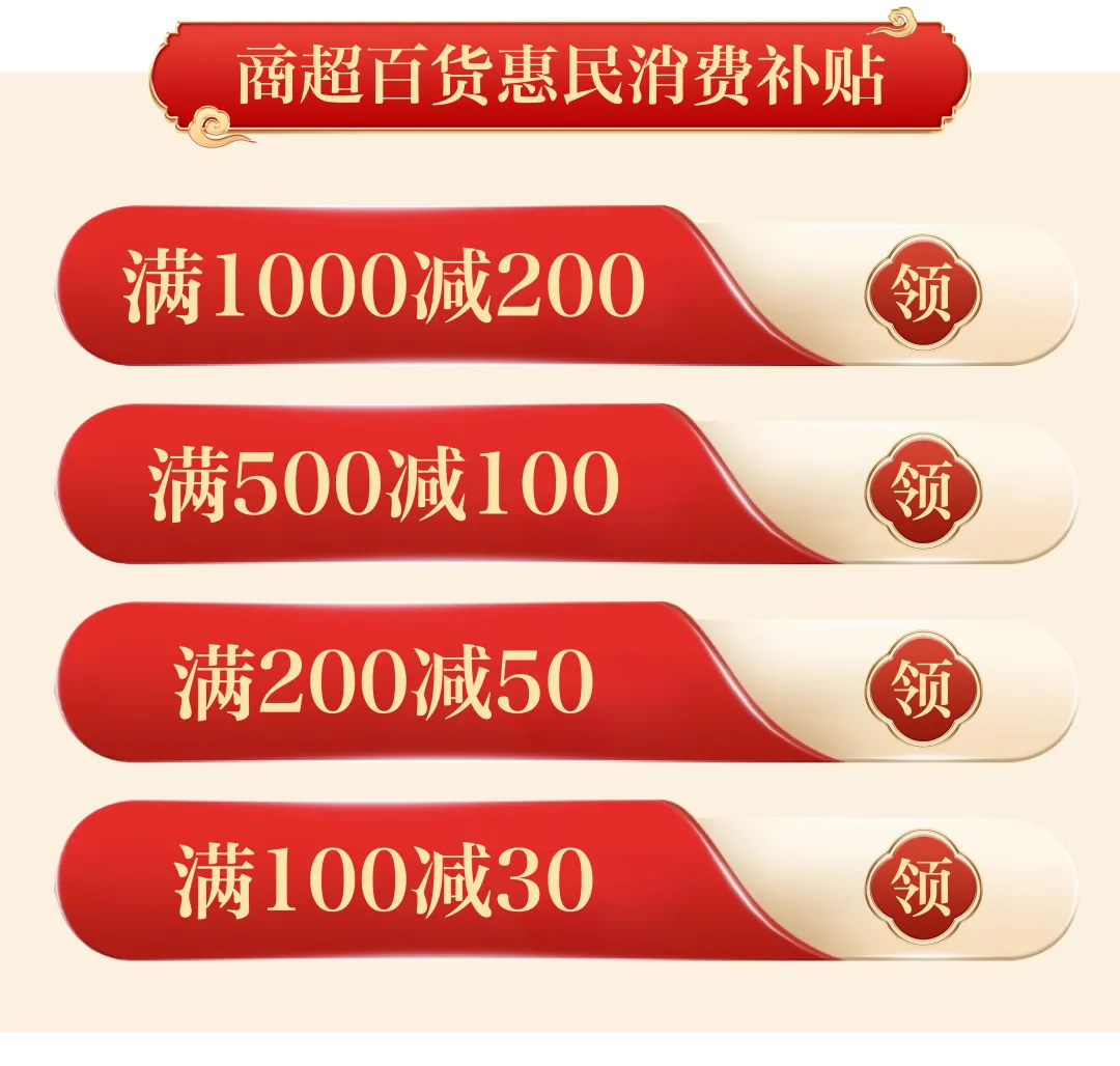百货零售惠民消费补贴券面值“满1000减200”“满500减100”“满200减50”“满100减30”。消费券可在参与商户购买百货、家电、日用品、服饰等全品类商品(不含香烟、虚拟商品)。