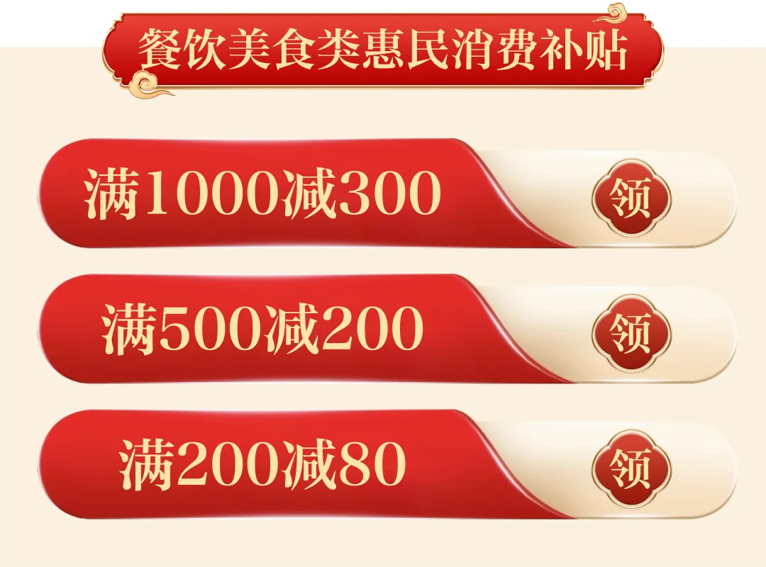 餐饮美食惠民消费补贴券面值设定为“满1000减300”“满500减200”“满200减80”。可在符合活动报名条件的餐饮类商户使用。