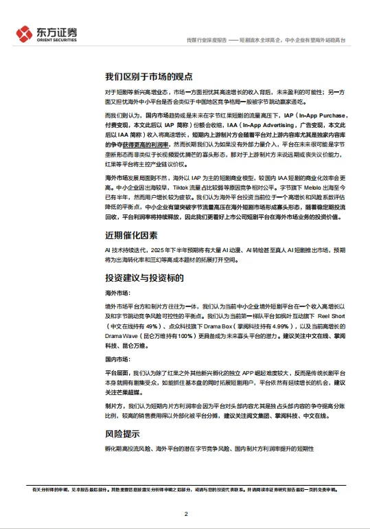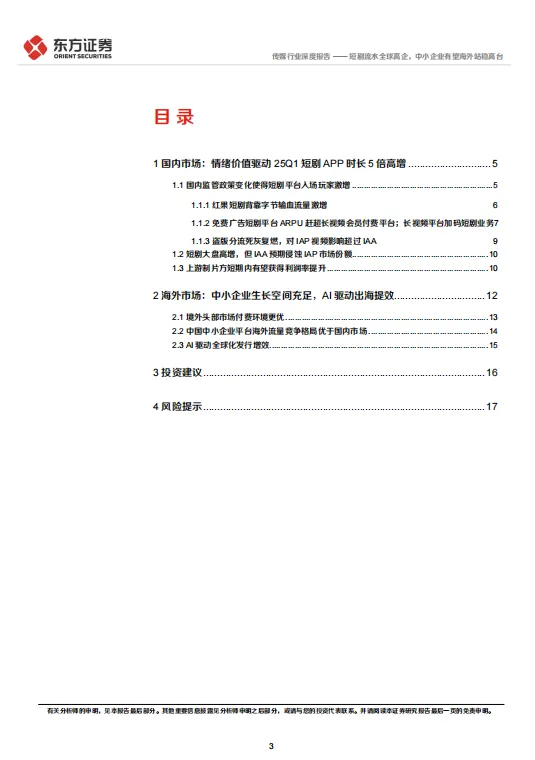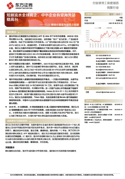 《传媒行业2025情绪价值系列报告之短剧》显示,2025Q1国内短剧APP使用时长同比增5.5倍,红果短剧广告ARPU达29元超长视频平台,海外市场付费环境更优,头部平台已实现盈利。情绪 “钩子” 密集、广告加载率高是短剧核心优势。 报告指出,海外中小企业凭借先发优势、多元流量渠道抵御字节竞争,AI技术赋能动漫短剧降本增效,推动全球化发行。国内制片方短期受益于平台分账比例提升,海外寡头格局初现。