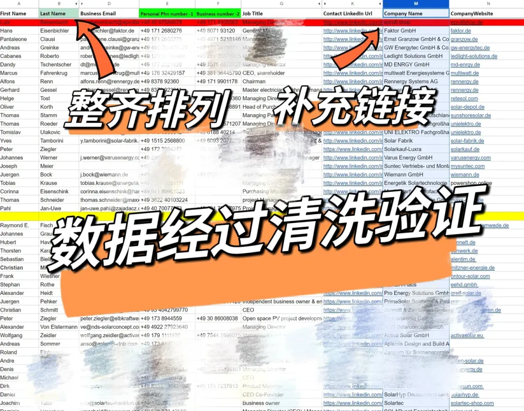 好了,数据基本干净了,接下来我们还得补充信息。你以为这些名片上就够了?太天真了!我们得给每个联系人加上公司网站、个人LinkedIn链接。这些都是客户研究和联系的重要信息,缺一不可!要自动化?想都别想,还是得靠人工一条条加。
