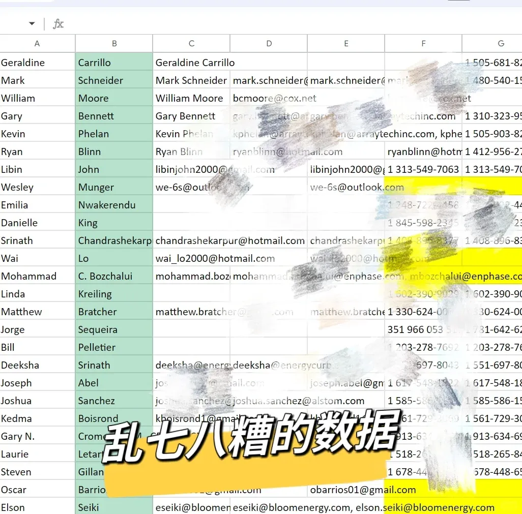 整理好了是不是可以休息了?想得美!接下来我们得检索有多少email格式不正确,电话格式不对劲的。像那种email写成“abc@.com”的电话号少了好几位数的,全得一个一个查出来改正。数据清理这一步,真是又耗时又费力,没个十遍八遍,你都不敢说自己眼睛还好使。