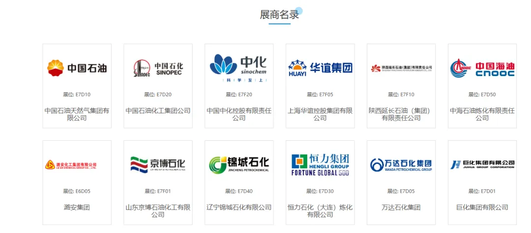 往届展商名单中包含了中国石油、中国石化、中国海油、国家能源、中国中化、万华化学等国内外知名化工企业。